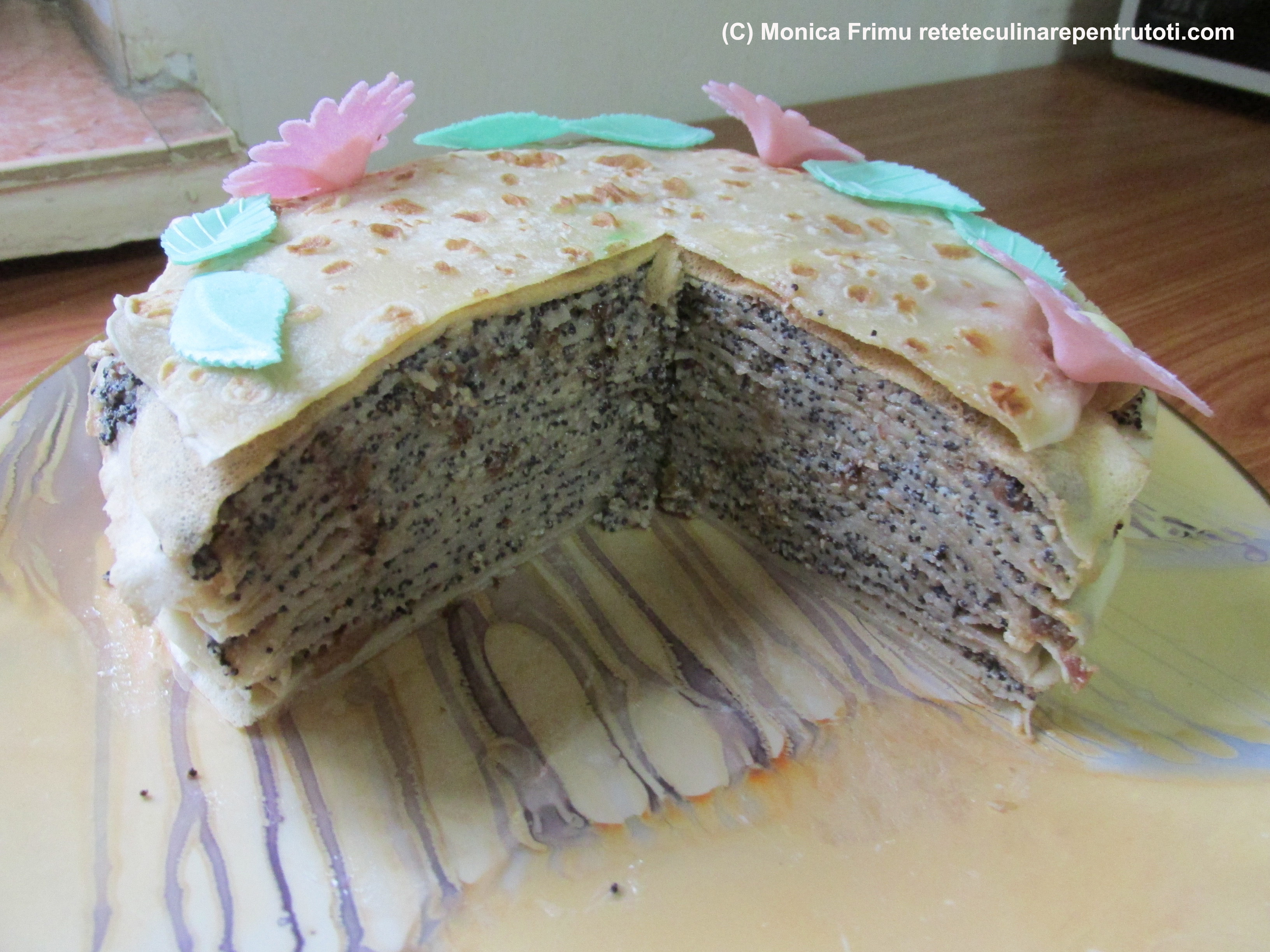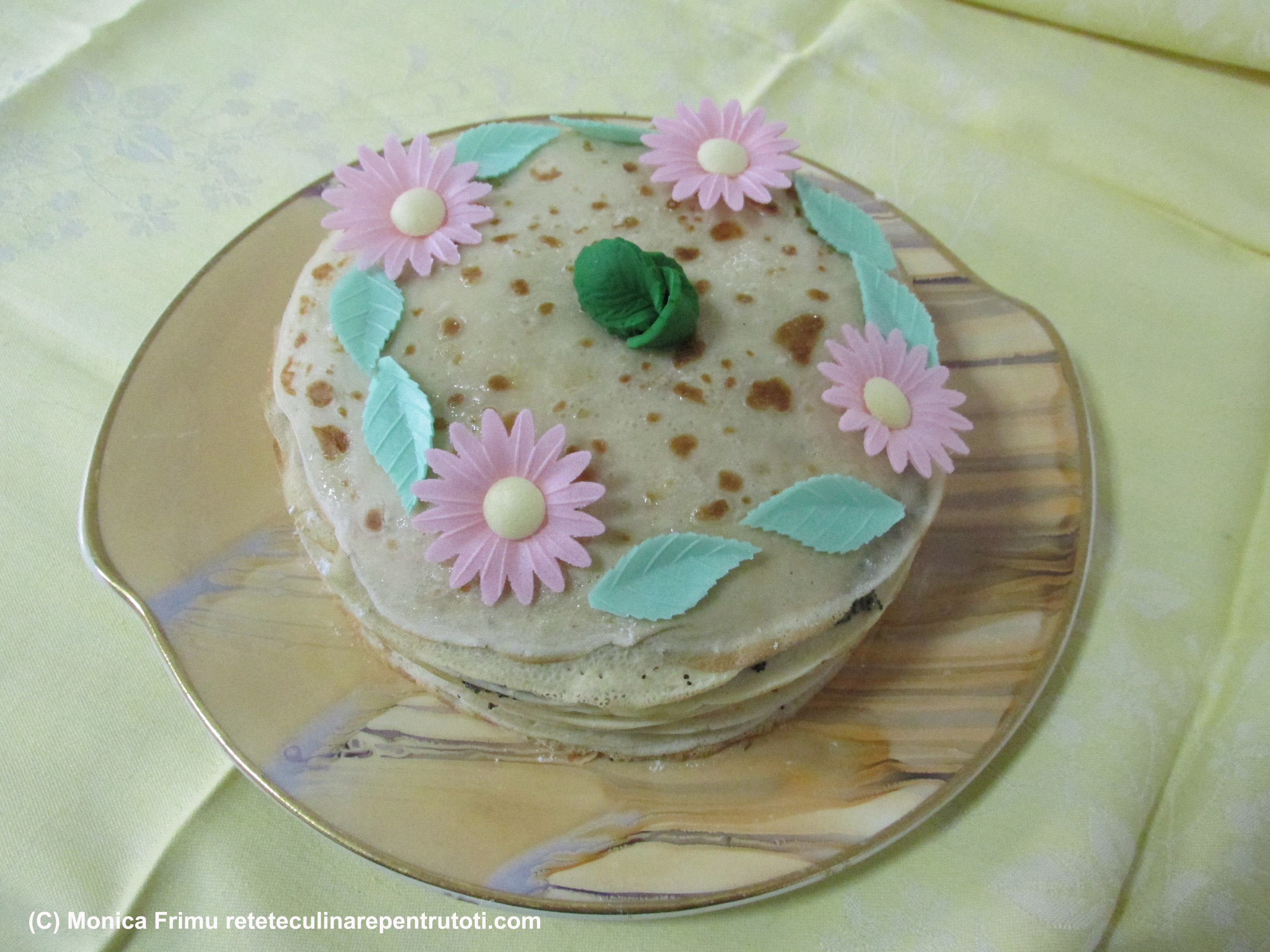 În continuare punem pe straturi o clătită, umplutură, până terminăm clătitele și umplutura, ultimul strat fiind clătită. Pudrăm cu zahăr praf vanilat, ornăm şi ţinem în frigider până la servire.