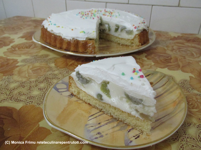 Acoperim cu a doua foaie de blat. Mixăm tare frișca și întindem peste blat. Decorăm cu boabe de struguri din compot. Punem în frigider câteva ore. Porționăm și servim.
