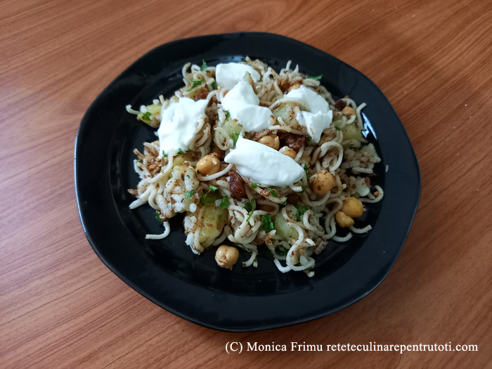 Într-un bol amestecăm cartofii orezul, tăițeii, semințele de fenicul, stafidele, cartofii, presărăm Chaat masala, coriandrul tocat și omogenizăm. Porționăm și servim, la alegere, cu iaurt, chutney de coriandru sau chutney de tamarind.