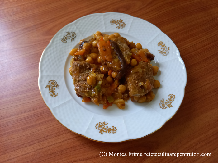 Tăiem carnea cuburi, amestecăm cu mixul de condimente, boabele de piper și uleiul. Îndepărtăm cojițele boabelor de năut, spălăm cu apă rece și scurgem. Curățăm ceapa și tăiem mărunt. Tocăm frunzele de țelină. Încălzim o tigaie teflonată pe foc mediu și prăjim carnea 3 minute. Punem ceapa, 1 lingură de apă și amestecăm 2 minute. Adăugăm năutul, frunzele de țelină, ½ linguriță sare și amestecăm 2 minute. Turnăm sosul de roșii și fierbem 2 minute. servim mâncarea caldă.