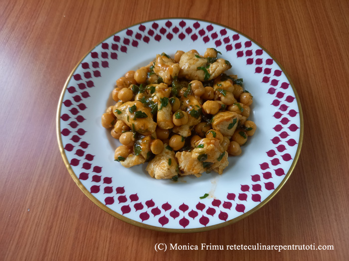 – 400 g piept de pui dezosat și fără piele, 1 conservă năut (240 g net), 50 g ceapă verde, 10 g frunze de țelină, 1 linguriță mix condimente marocane, 150 g sos de roșii, sare, 1 lingură ulei, 1 linguriță boabe de piper negru, apă