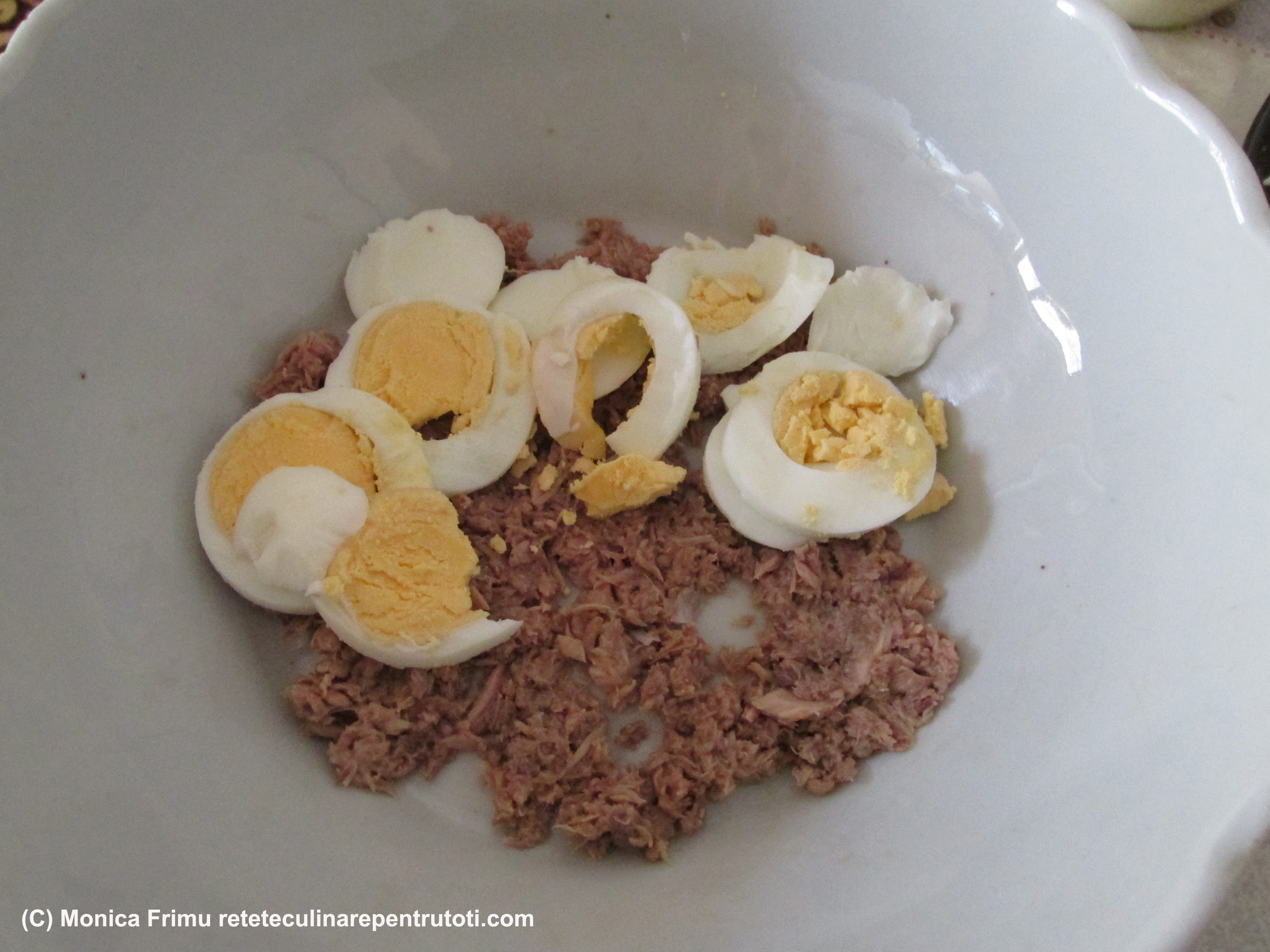 – 1 conservă de ton în ulei, 1 ceapă, 1/2 ardei roșu, 1 morcov fiert (100 g), 3 linguri mazăre fiartă, 30 g măsline verzi, 4 roșii Cherry, 1 lingură oțet de vin alb, sare, piper alb măcinat, 1 lingură ulei de măsline