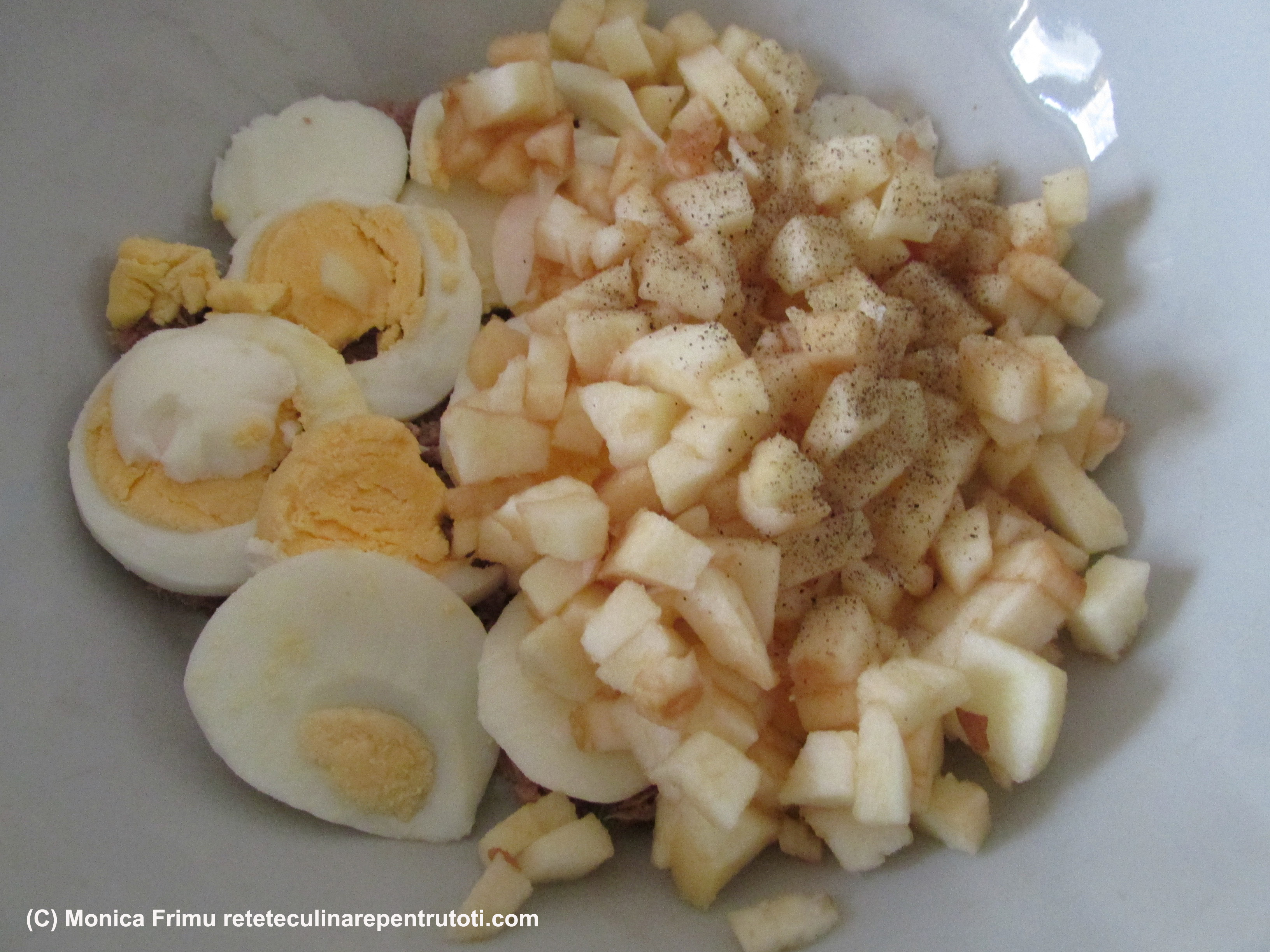 Scurgem peștele. Curățăm și tăiem ceapa mărunt, ardeiul și roșiile bucățele, morcovul cuburi. Amestecăm într-un bol oțetul, uleiul, sare și piper după gust. În castronul de servit punem toate ingredientele, turnăm amestecul cu oțet și omogenizăm. Putem păstra în frigider.