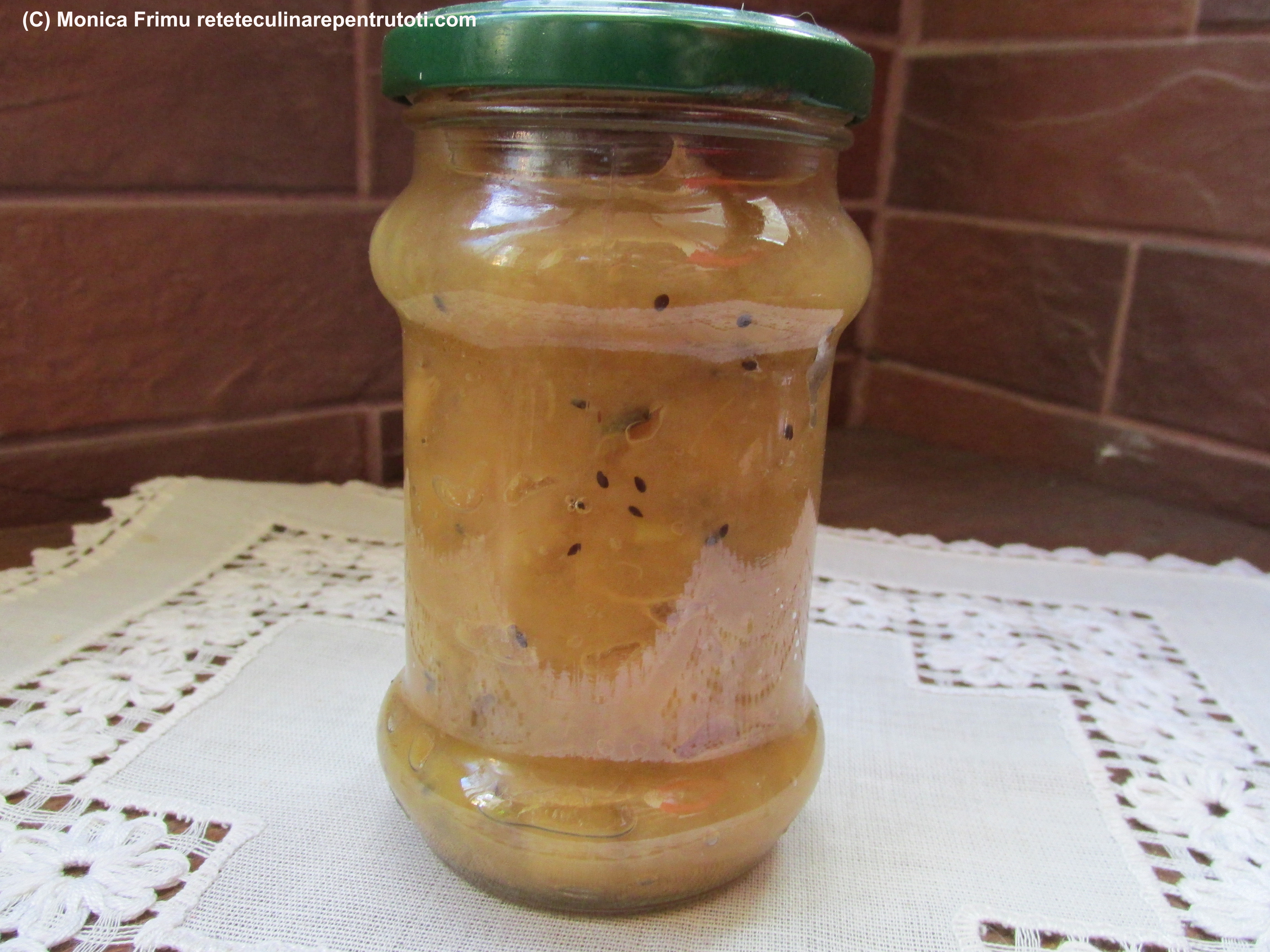 Separat amestecăm făina de porumb cu boia şi amestecăm într-o cană de apă, turnăm în oală. Fierbem 10 min. amestecând din când în când. Punem compoziţia în borcane sterile (să fie acoperită cu lichid), închidem şi răcim „în haine”. Se poate consuma după 15 zile.
