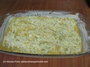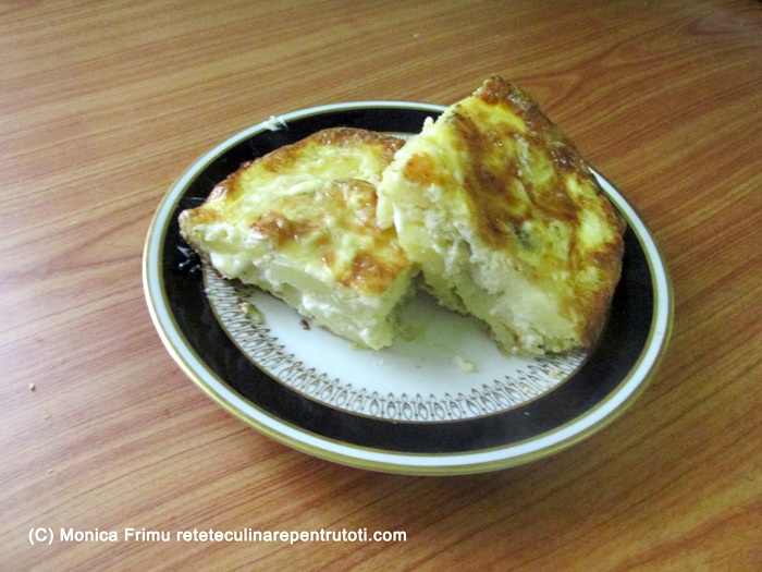 Repetăm operațiile, acoperim cu cele 4 clătite și ungem cu ulei. Punem în cuptorul preîncălzit la foc mai mare (200) 20 minute. Răcorim 10 minute, răsturnăm pe un platou, tăiem felii și servim.