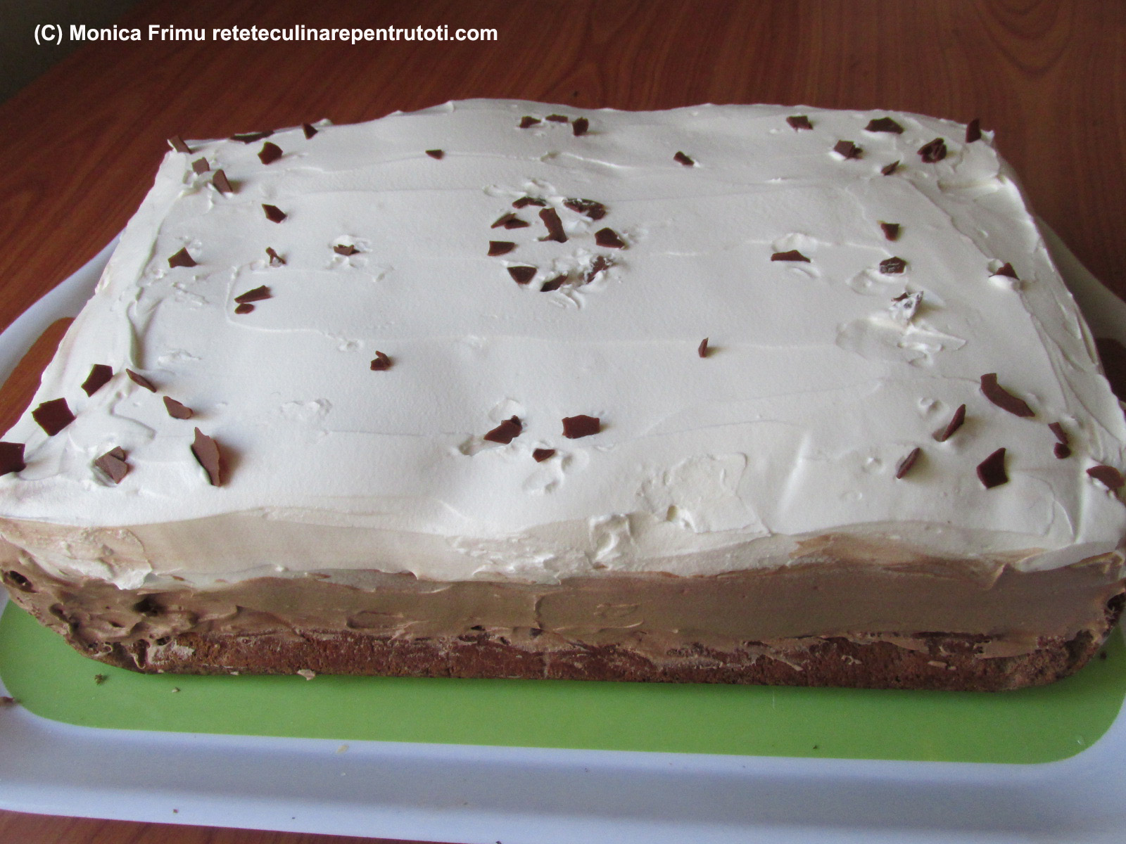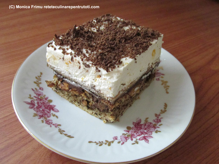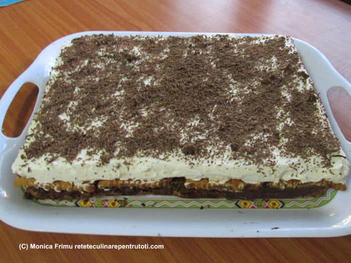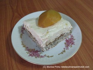 Deasupra întindem crema cu ricotta. Ornăm cu sâmburi de caise și decor de ciocolată. Punem în frigider până a doua zi. Porționăm și servim.