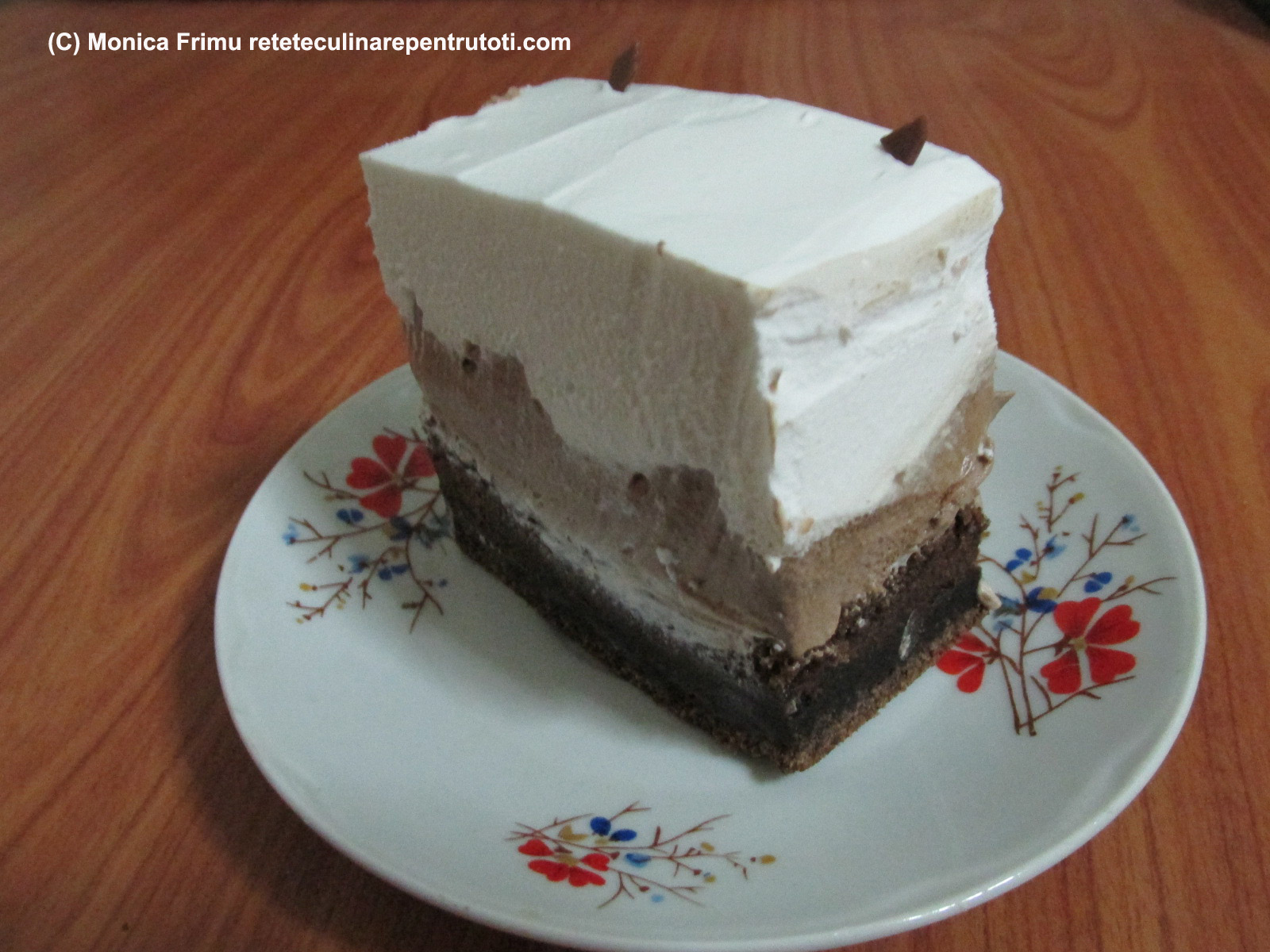 – 4 albușuri, 1 gălbenuș, 300 g zahăr, 1 plic zahăr vanilat, 250 g ricotta, 150 ml lapte, 200 ml frișcă, 50 g crema de ciocolată cu lapte, 60 g sâmburi de caise măcinați, 1 plic gelatină (10 g), sare; pentru ornat sâmburi de caise și decor de ciocolată