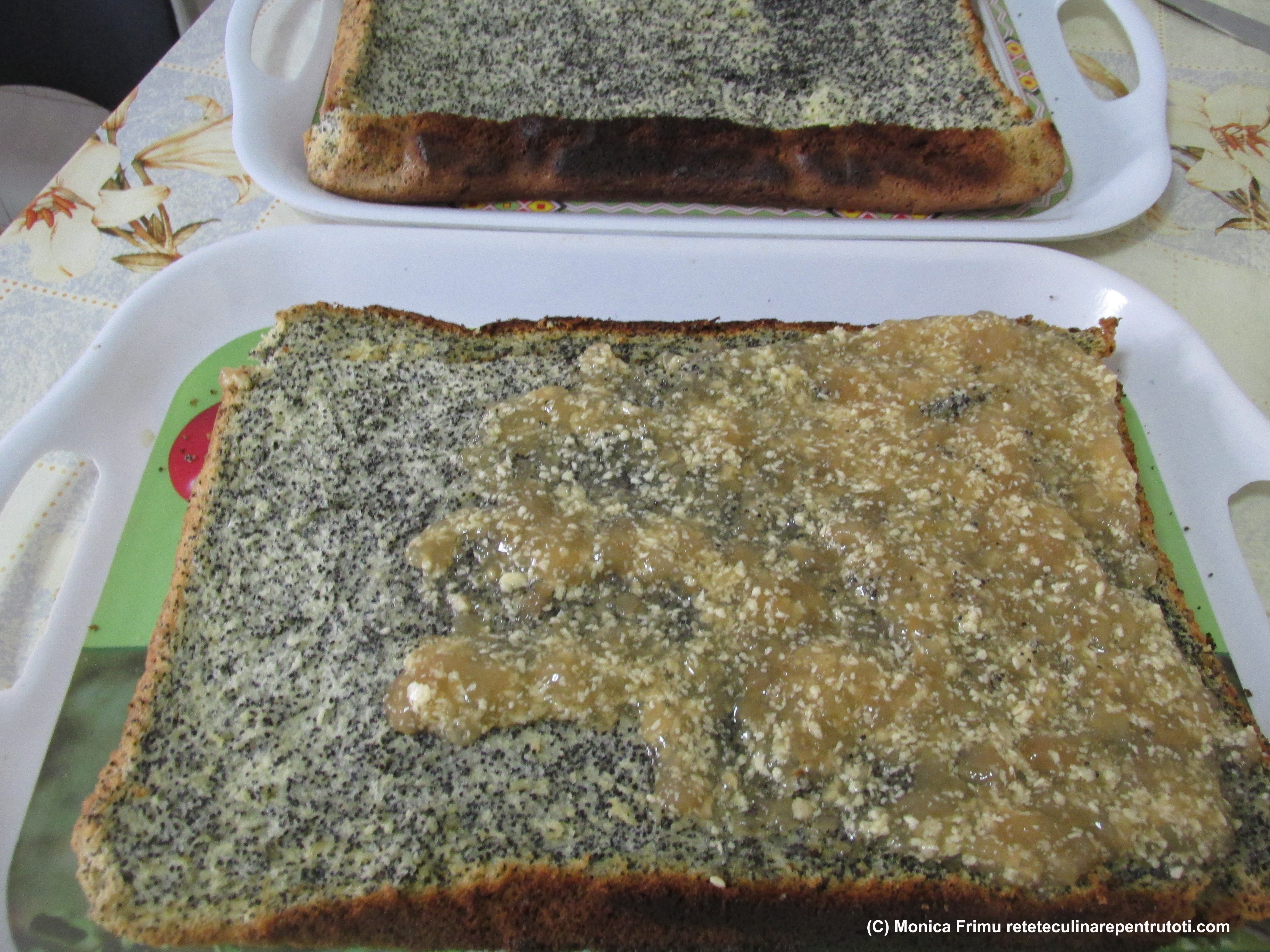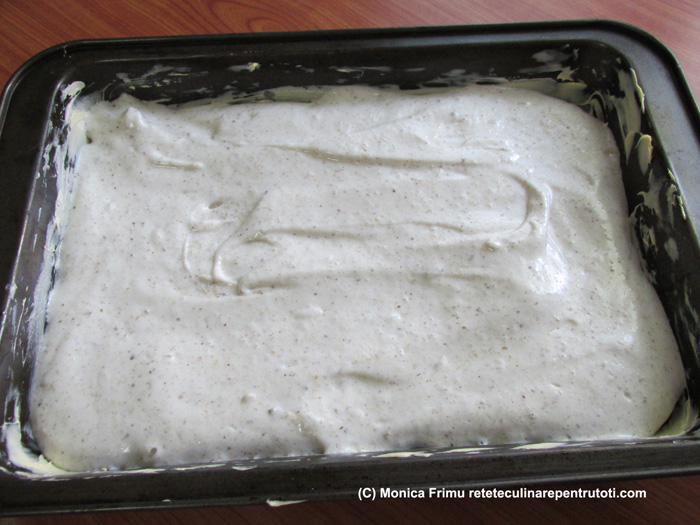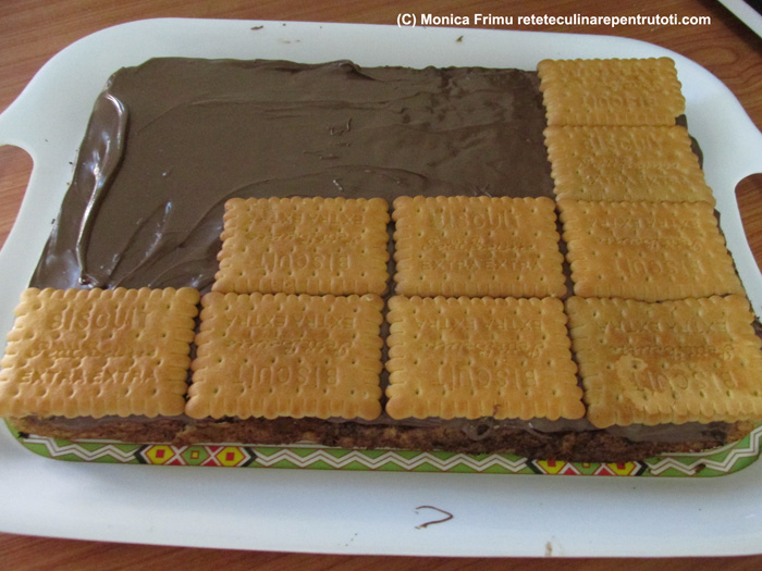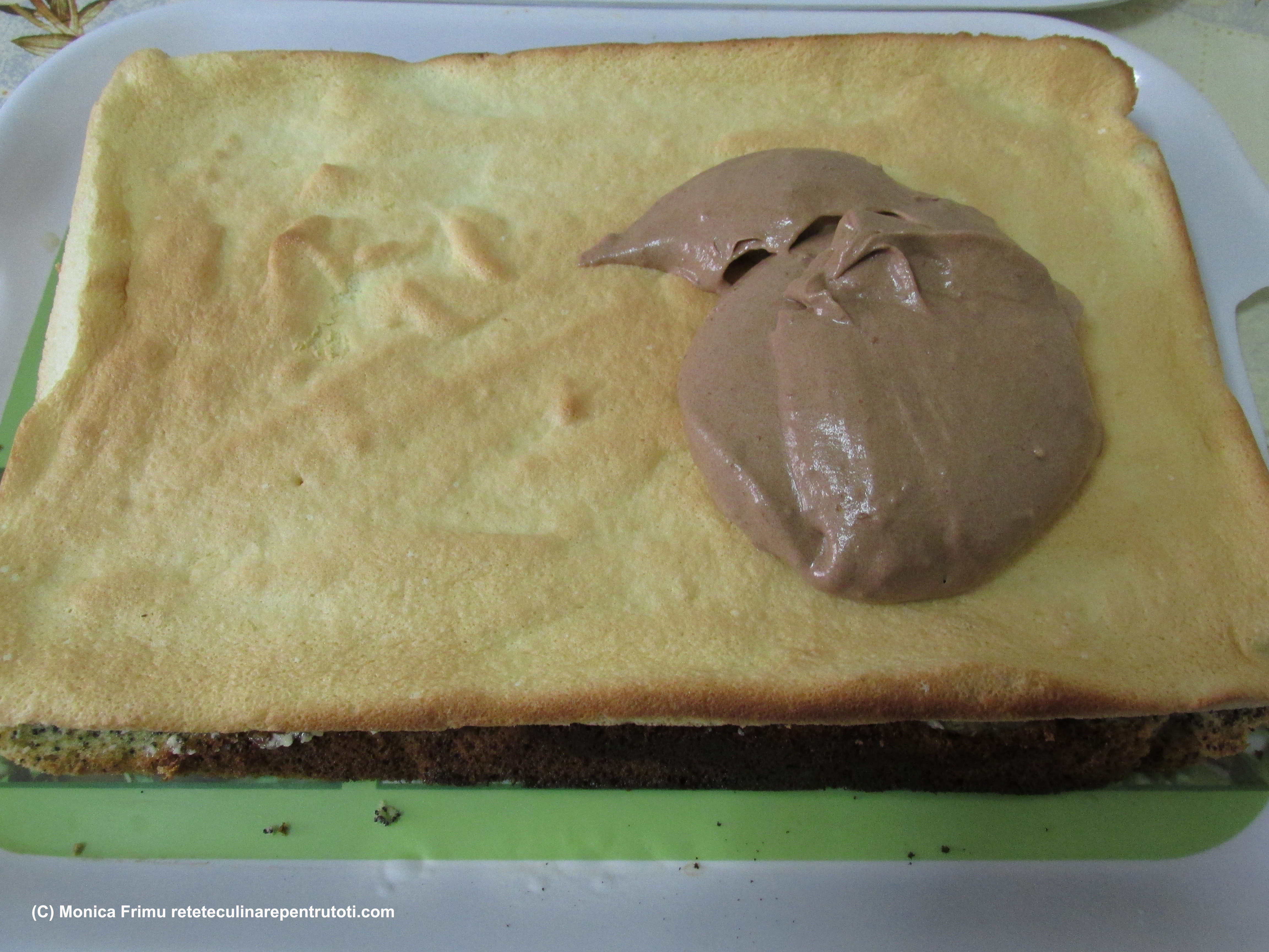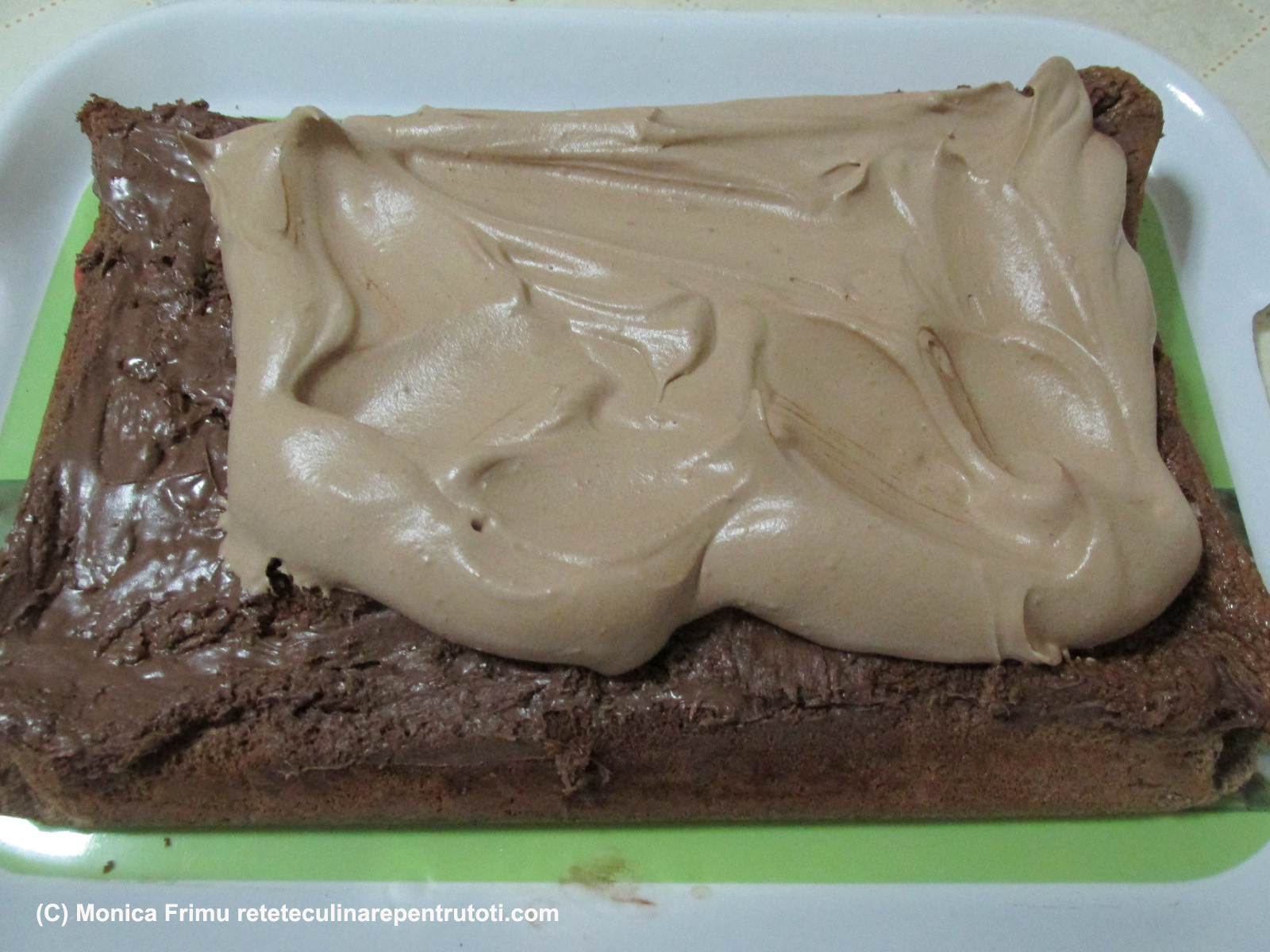 Îndepărtăm ușor hârtia și așezăm blatul pe un platou. Întindem uniform crema de ciocolată peste foaia de bezea, având grijă să nu o rupem și presărăm sâmburii de caise măcinați.