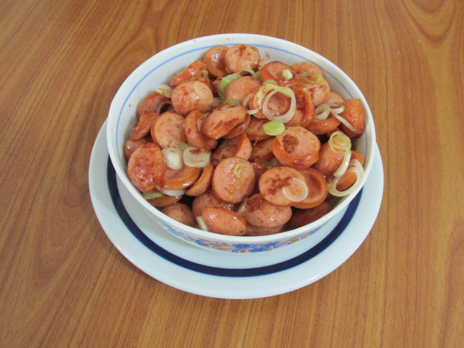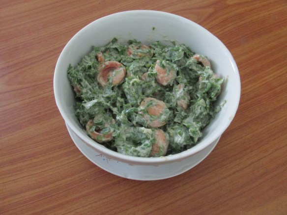 – 250 g varză chinezească, 100 g morcovi, 2 crenvuști de porc (125 g), 150 g iaurt gras, 2 lingurițe cimbrișor uscat, 1 linguriță piper negru măcinat, ½ linguriță sare, 1 lingură ulei