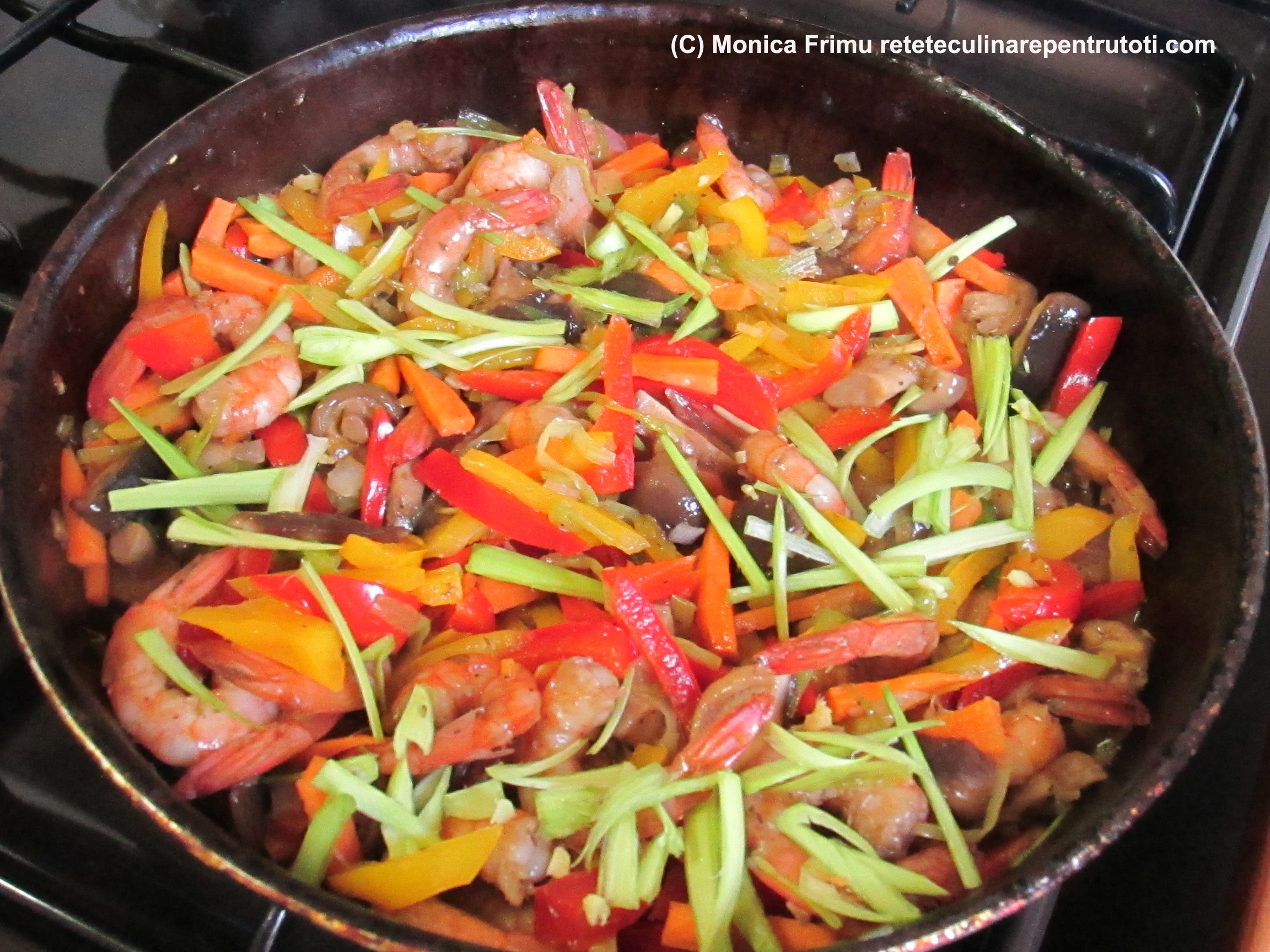 În farfuriile în care vom servi punem orez, deasupra creveții cu sosul obținut, presărăm ceapă verde, pătrunjel, fulgi de migdale opțional. Servim imediat.