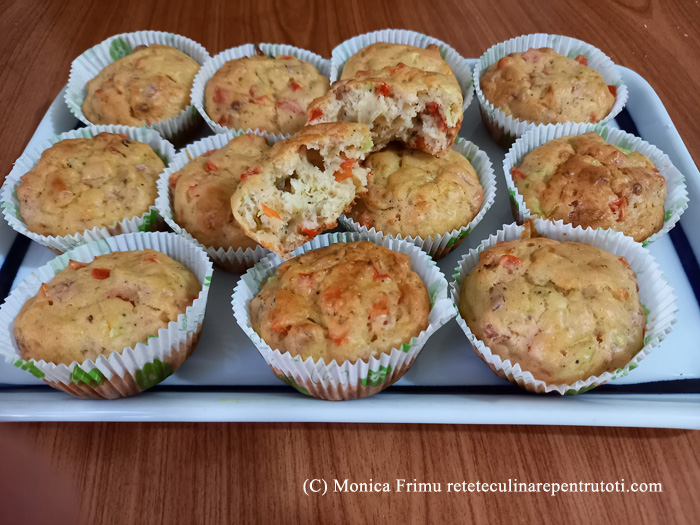 Curățăm dovlecelul, radem mare, amestecăm cu sarea, lăsăm să stea 15 minute, scurgem bine și punem într-un bol. Tăiem mărunt mușchiul, curățăm ardeiul, tăiem cubulețe și le amestecăm cu dovlecelul. Încorporăm pe rând praful de copt, făina, coriandrul, sarea, piperul , ouăle și omogenizăm. Ungem cu ulei formele unei tăvi pentru brioșe și tapetăm cu hârtiuțe. Umplem ¾ cu compoziția. Punem în cuptorul preîncălzit la foc mediu (180) 25 minute (testul cu scobitoarea). Răcim, îndepărtăm hârtiile și servim.