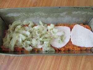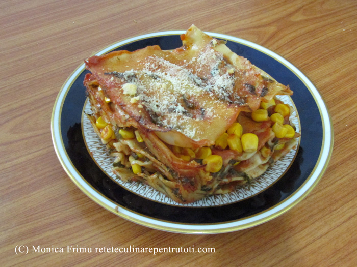 – 300 g foi de lasagna, 50 g ceapă verde, 500 ml bulion de roșii, 1 conservă boabe de porumb (285 g net), 150 g mușchi file, 1 lingură brânză rasă pentru paste, 1 lingură făină, 1 linguriță zahăr, ulei, sare, piper
