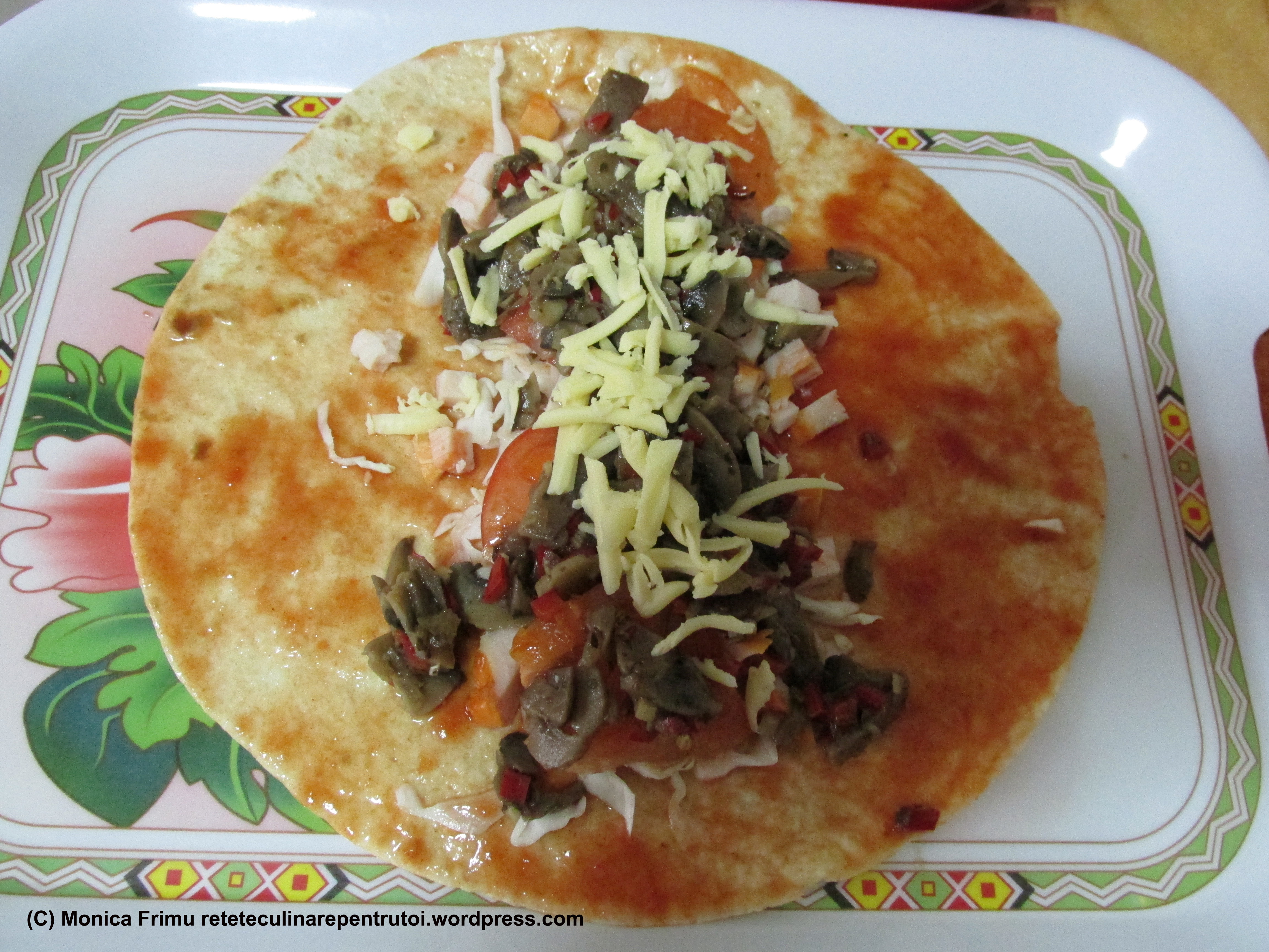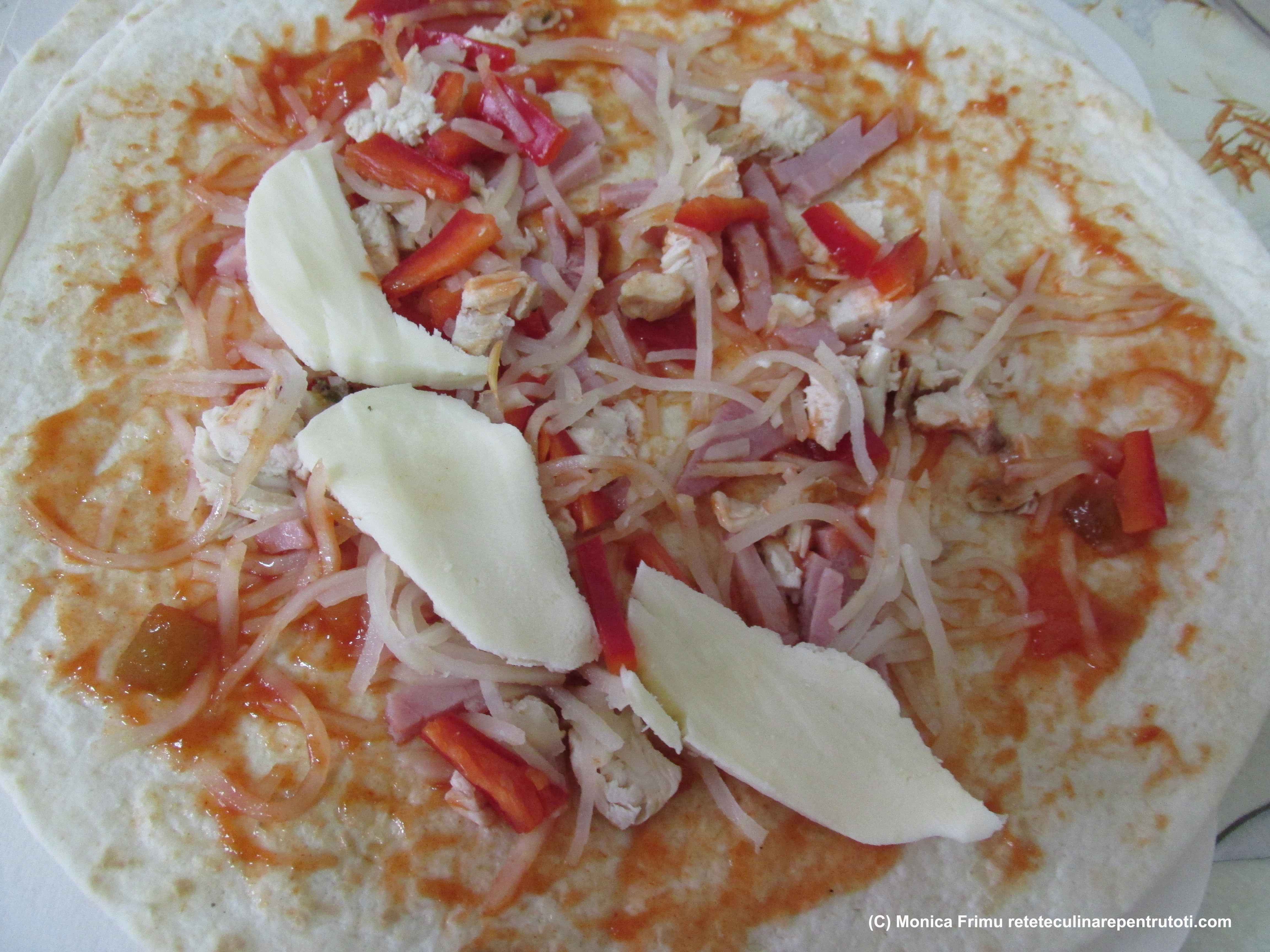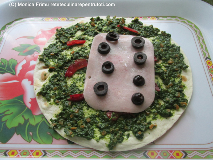 Tăiem ceapa verde rondele, brânza bucățele. Ungem o foaie de tortilla cu 1/2 passata de tomate, acoperim cu 1/2 felii de șuncă, presărăm puțină ceapă.