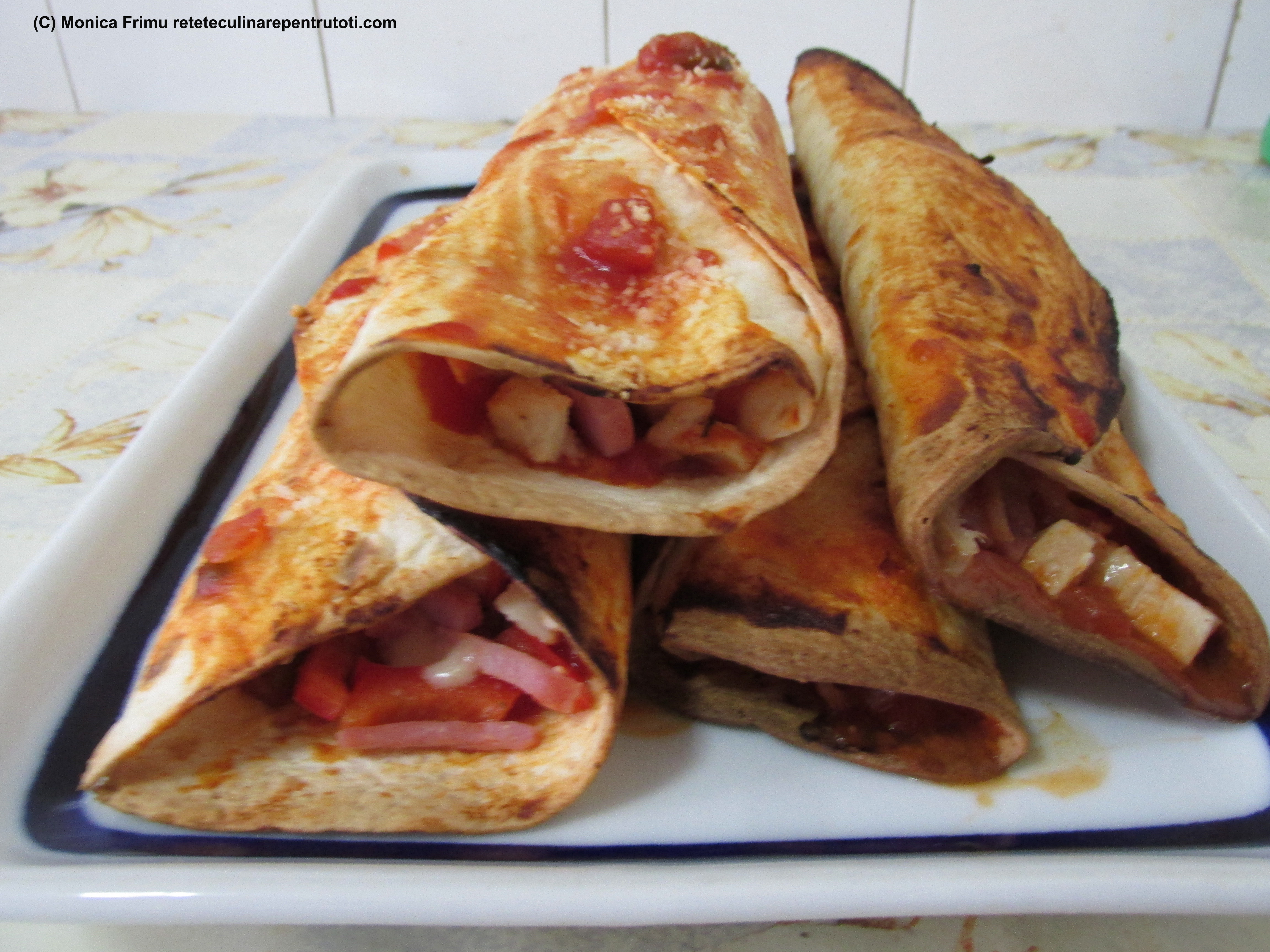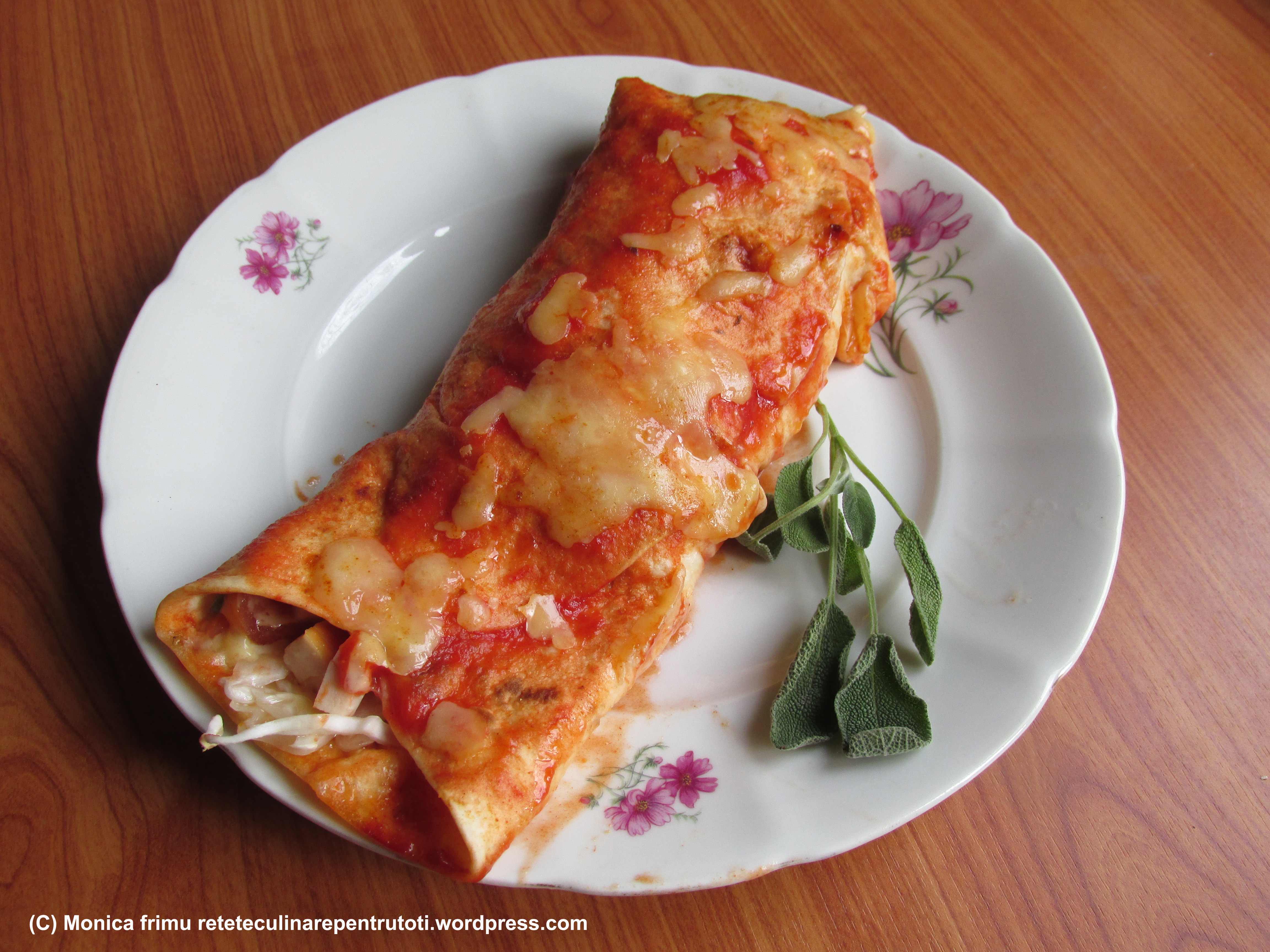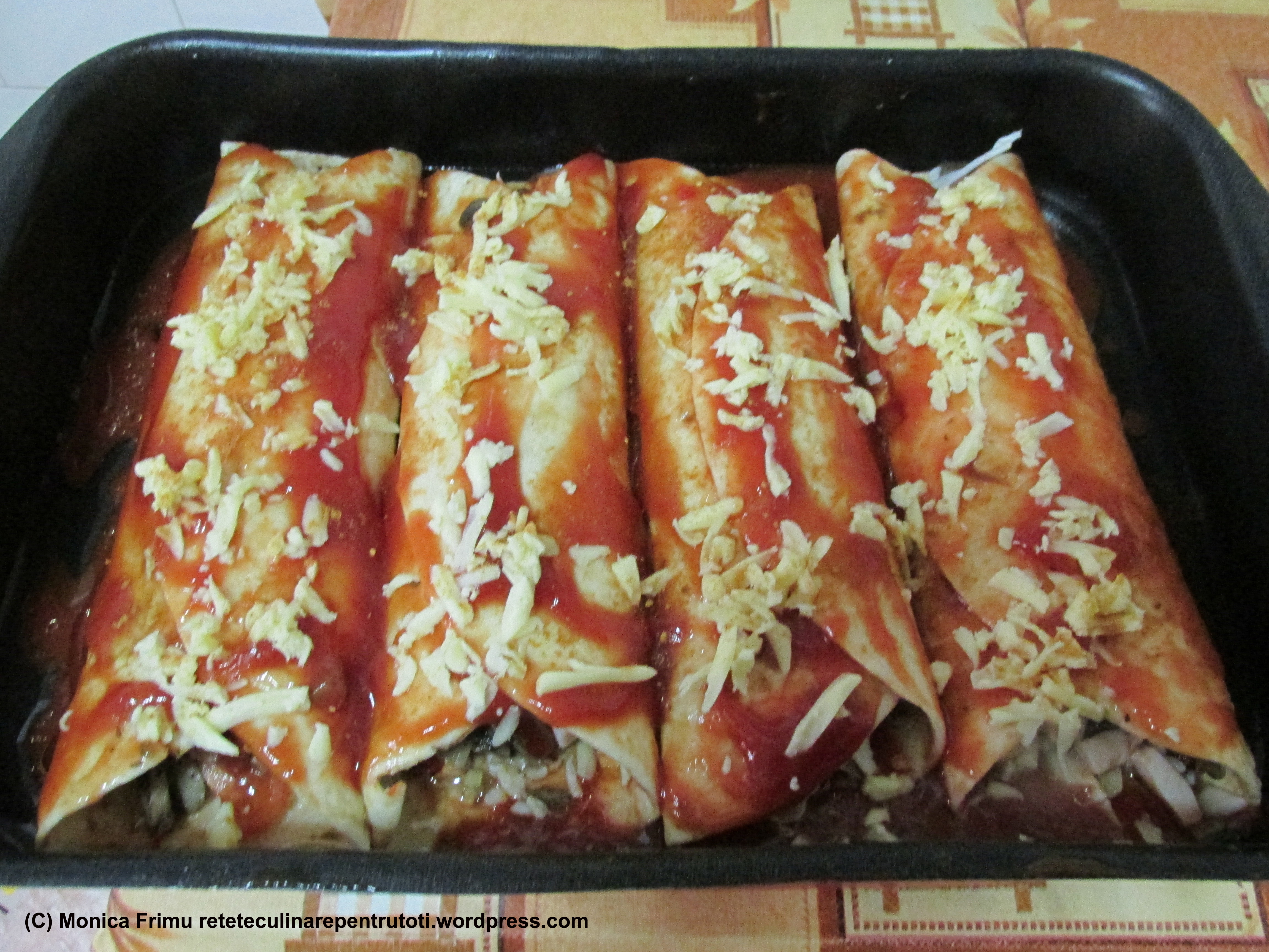 Repetăm operațiile folosind cele 4 foi de tortilla. Rulăm și punem într-un vas Yena uns bine cu ulei. Acoperim cu sos de mărar.