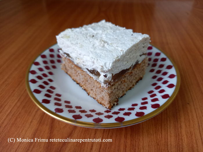 Amestecăm 150 g nuci cu pesmetul. Mixăm albușurile spumă tare cu un praf de sare, adăugăm zahărul, zahărul vanilat și mixăm până devin cremoase și lucioase. Punem gălbenușurile, mixăm câteva secunde, până se încorporează, adăugăm amestecul cu pesmet și omogenizăm. Tapetăm o tavă (32×22 cm) cu hârtie de copt și întindem uniform compoziția. Punem în cuptorul preîncălzit la foc mai mare (200) cca. 15 minute (testul cu scobitoarea). Răcim, îndepărtăm hârtia și așezăm pe un platou. Acoperim cu jeleul. Mixăm frișca tare, amestecăm cu 50 g nuci și întindem uniform peste jeleu. Punem în frigider 2-3 ore. Porționăm și servim.