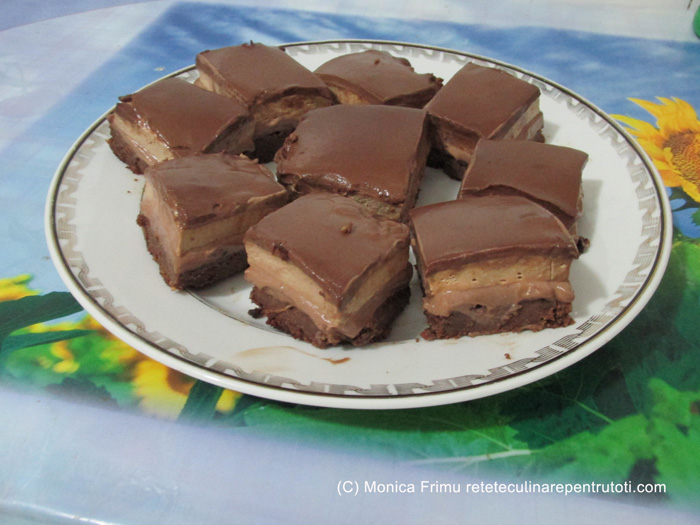Frecăm bine untul cu zahărul, adăugăm ouăle și omogenizăm. Tăiem mărunt ciocolata, turnăm 3 linguri frișcă și topim pe foc mic. Răcorim și încorporăm în compoziția din ouă. Punem nucile și omogenizăm. Tapetăm o tavă cu hârtie de copt și întindem uniform compoziția. Punem în cuptorul preîncălzit la foc mediu aproximativ 30 minute (testul cu scobitoarea) apoi răcim.