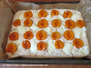 Tăiem caisele ½ și îndepărtăm sâmburii. Mixăm untul moale cu zahărul, zahărul vanilat până devine spumos. Adăugăm pe rând ouăle, făina amestecată cu praful de copt, smântâna, bombonelele de ciocolată și omogenizăm. Întindem uniform într-o tavă tapetată cu hârtie de copt. Cu o lingură punem din loc în loc budinca rece și caisele cu partea tăiată în sus.