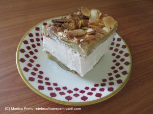 Mixăm frișca tare. Scoatem crema din frigider, mixăm puțin, adăugăm câte o lingură de frișcă și amestecăm ușor cu o spatulă. Îndepărtăm hârtia de la o bucată de foaie, așezăm pe un platou, cu bezeaua în sus și întindem crema. Îndepărtăm hârtia de la a doua bucată de foaie și acoperim crema, așezând-o cu bezeaua în sus. Punem în frigider 2-3 ore.