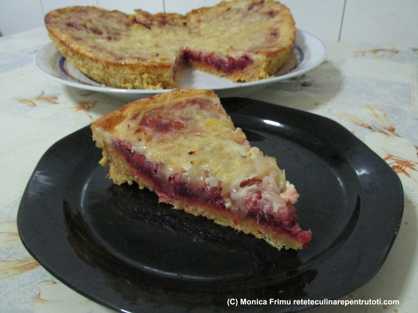 Amestecăm tărâțele cu fulgii de ovăz, făina, zahăr brun, untul ținut la temperatura camerei, 1 plic de zahăr vanilat și obținem un ”aluat” sfărâmicios, ca niște biluțe. Scoatem sâmburii vișinelor. Amestecăm pe foc 50 ml apă cu zahărul, scorțișoara, coaja de lămâie, 1 plic de zahăr vanilat, până obținem un sirop în care punem vișinele și mai lăsăm câteva minute la foc mediu, amestecând continuu. Dizolvăm amidonul în 30 ml apă rece, turnăm peste vișine și amestecăm continuu, la foc mic, până dă în clocot, mărim focul și amestecăm în continuare până se îngroașă și devine lipicioasă. Răcorim 3 min. și amestecăm cu sucul de vișine și esența de migdale. Într-o tavă tapetată cu hârtie de copt întindem 2/3 din compoziția de blat. Deasupra întindem compoziția cu vișine. Restul compoziției de blat o amestecăm cu fulgii de migdale și presărăm peste vișine. Punem în cuptorul preîncălzit la foc mai mic (160) 20 min., până se rumenește ușor. Răcim, îndepărtăm hârtia și punem pe un platou. Servim tăiată pătrate.