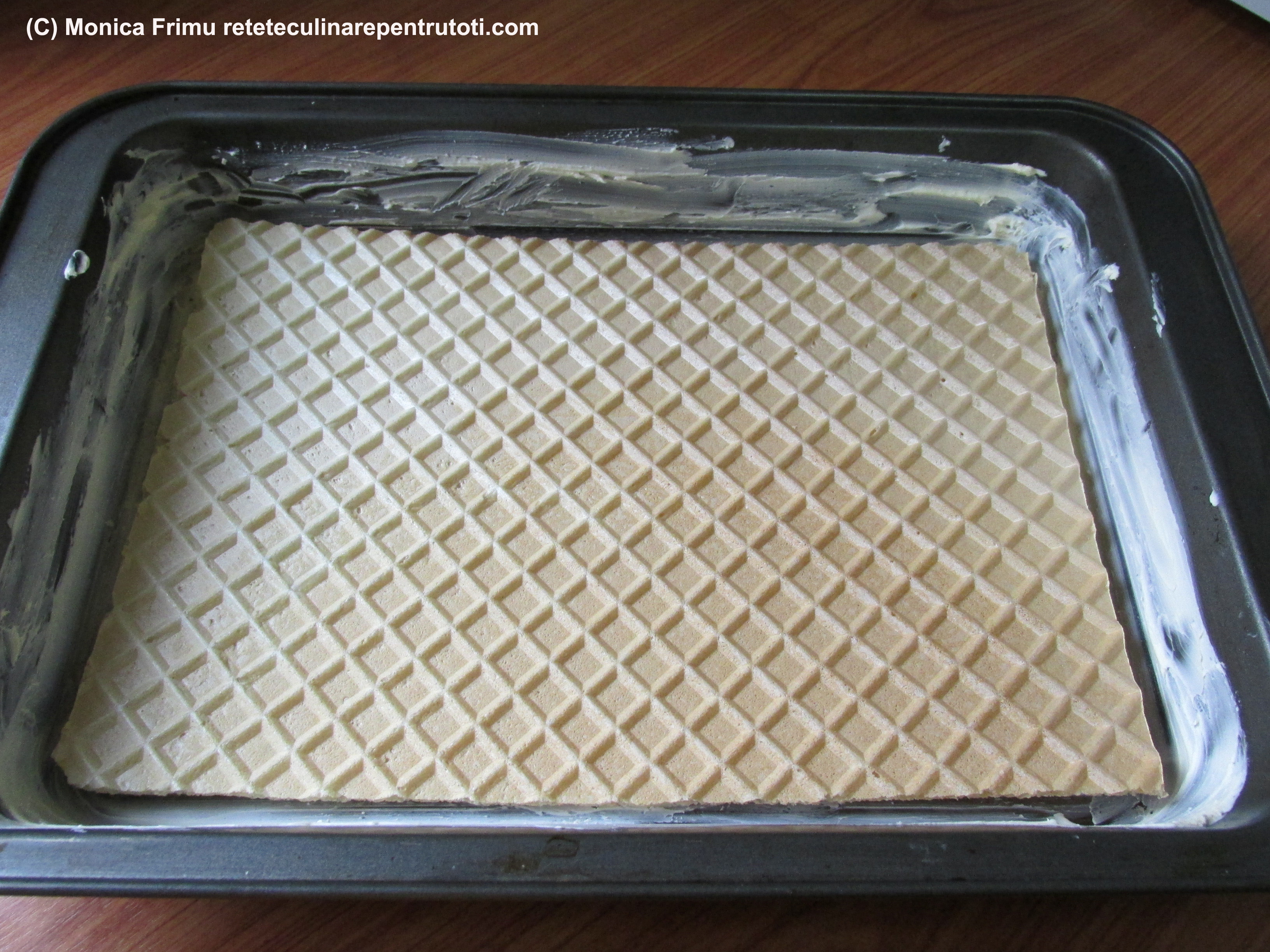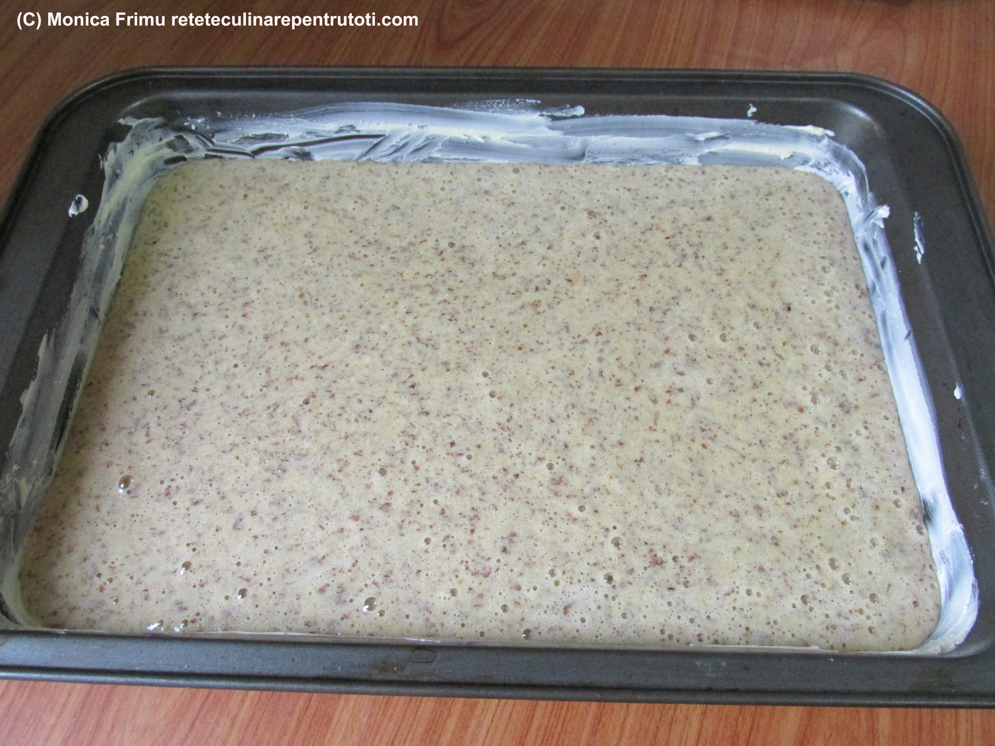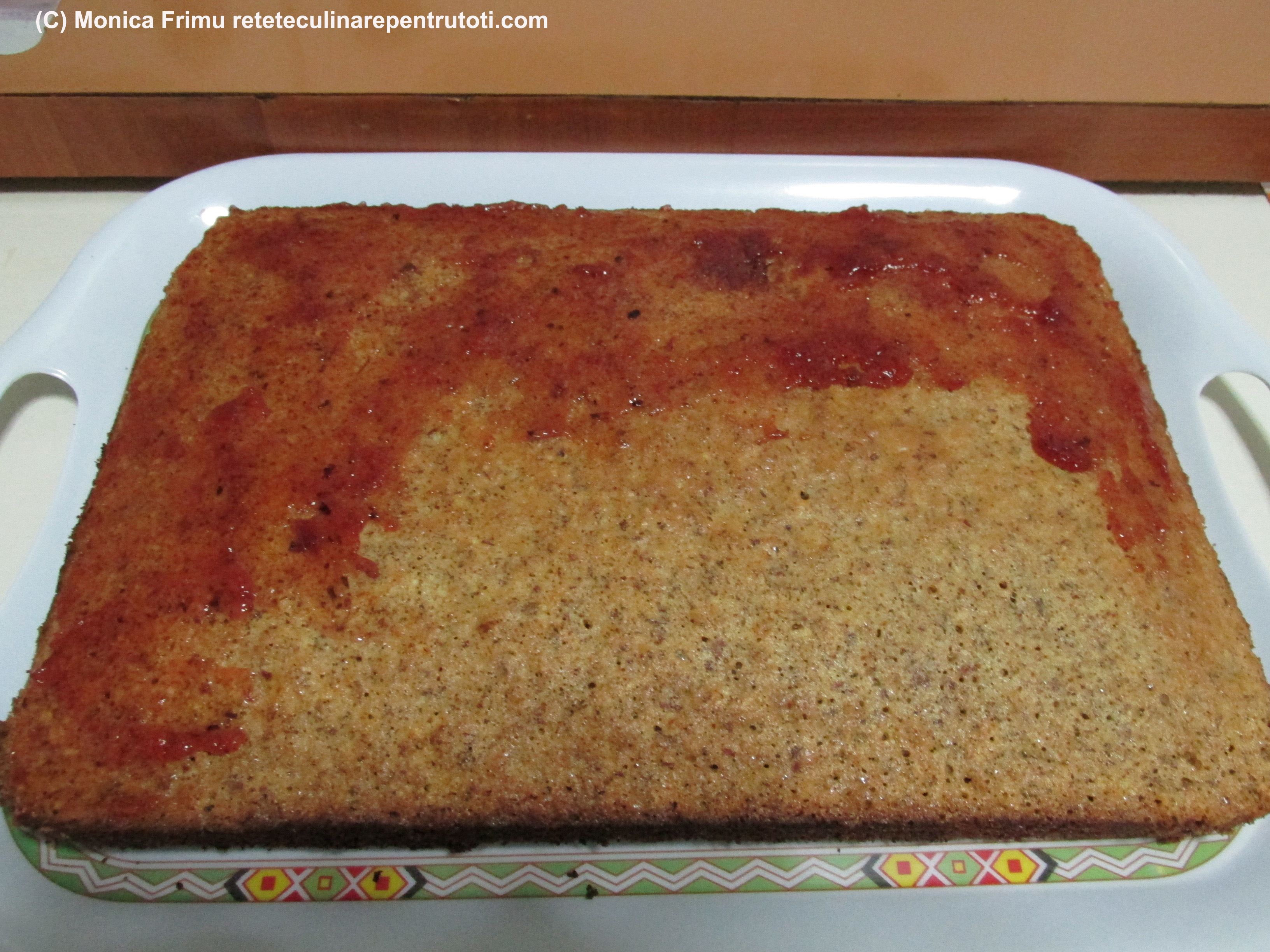Topim untul și răcim. Mixăm gălbenușurile cu zahărul până devin albicioase și cremoase. Mixăm albușurile spumă tare cu un praf de sare, încorporăm gălbenușurile, amestecând ușor cu o lingură. Punem pe rând făina, untul și amestecăm până obținem o pastă omogenă. O întindem pe o foaie de hârtie de copt, unsă cu ulei și o așezăm pe fundul tăvii.