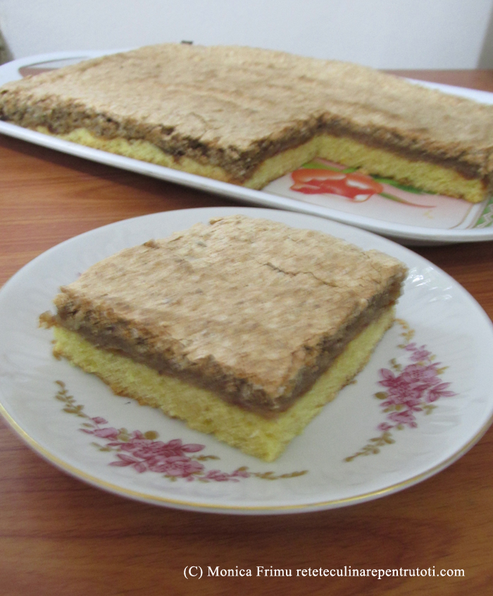 Pentru un blat mixăm 3 albușuri spumă tare cu un praf de sare. Adăugăm zahărul și mixăm până devin cremoase și lucioase. Punem gălbenușurile și mixăm câteva secunde până omogenizăm. Încorporăm 4 linguri de făină amestecând ușor cu o lingură. Întindem uniform într-o tavă tapetată cu hârtie de copt. Punem în cuptorul preîncălzit la foc mediu (180) 15 minute, până se desprind marginile blatului de hârtie. La fel procedăm cu a doua foaie de blat punând doar 3 linguri de făină, în plus 1 lingură de cacao. Răcim, îndepărtăm hârtia și așezăm primul blat pe un platou. Întindem uniform crema de gris. Acoperim cu al doilea blat, presăm ușor și acoperim cu crema de nuci. Punem în frigider până a doua zi. Porționăm și servim.