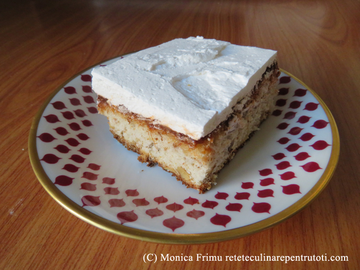 Mixăm albușurile spumă tare cu un praf de sare. Adăugăm treptat zahărul rămas și mixăm până devin cremoase și lucioase. Încorporăm nucile, amestecând cu o lingură. Întindem compoziția peste gem și nivelăm. Punem în cuptorul preîncălzit la foc mediu (180) aproximativ 25 minute, până se rumenește. Răcim în tavă. Transferăm pe un platou, porționăm și servim.
