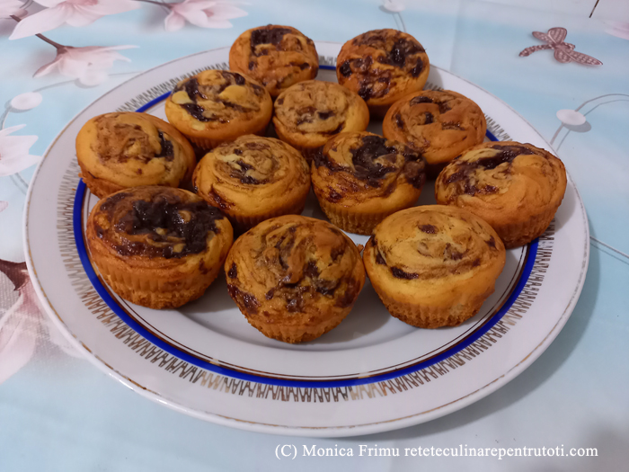 Amestecăm făina cu praful de copt. Mixăm albușurile spumă tare cu un praf de sare. Adăugăm zahărul, zahărul vanilat și mixăm până devin lucioase și cremoase. Amestecăm gălbenușurile cu uleiul, punem peste albușuri și amestecăm cu o lingură. Adăugăm făina și omogenizăm. Tapetăm cu hârtiuțe formele unei tăvi pentru brioșe. Pe fiecare o umplem 1/3 cu compoziția obținută. În mijloc punem o linguriță de gem. Restul compoziției amestecăm cu cacao și acoperim gemul. În total formele trebuie să fie umplute ¾. Punem în cuptorul preîncălzit la foc mediu aproximativ 20-25 minute (testul cu scobitoarea). Răcim, îndepărtăm hârtiuțele, opțional presărăm zahăr praf și servim.