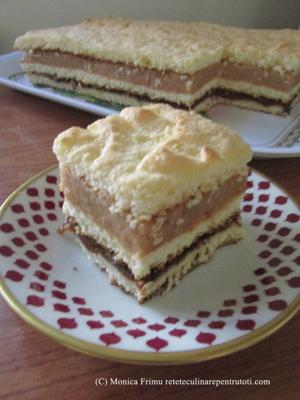 Amestecăm făina cu margarina, adăugăm 1 ou și 2 gălbenușuri, zahărul, zahărul vanilat, bicarbonatul și frământăm un aluat omogen pe care îl împărțim în trei. Pe masa de lucru presărăm făină și cu ajutorul unui făcăleț vom întinde trei foi de dimensiunea tăvii. Tapetăm tava cu hârtie de copt, punem o foaie și o ungem cu jumătate din cantitatea de gem. Așezăm a doua foaie, o ungem cu restul de gem și presărăm pe toată suprafața nucile. Acoperim cu a treia foaie. Punem în cuptorul preîncălzit la foc mediu până începe să se rumenească, aproximativ 30 minute. Scoatem din cuptor, presărăm zahărul praf vanilat sau întindem uniform glazura și răcim în tavă.