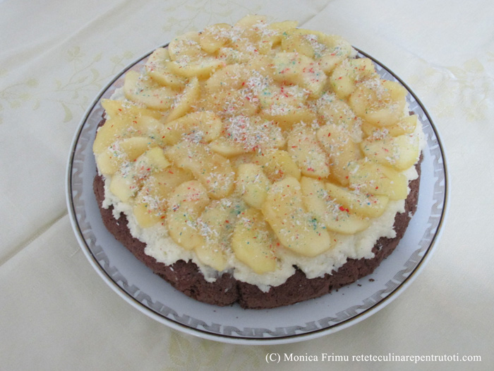 Curățăm merele, tăiem felii, stropim cu Hellas și amestecăm cu zahărul. Într-o tigaie teflonată topim margarina, punem merele și amestecăm din când în când 5 minute. Acoperim cu ele suprafața grisului și presărăm deasupra cocosul colorat. Răcim și punem în frigider până la servire.