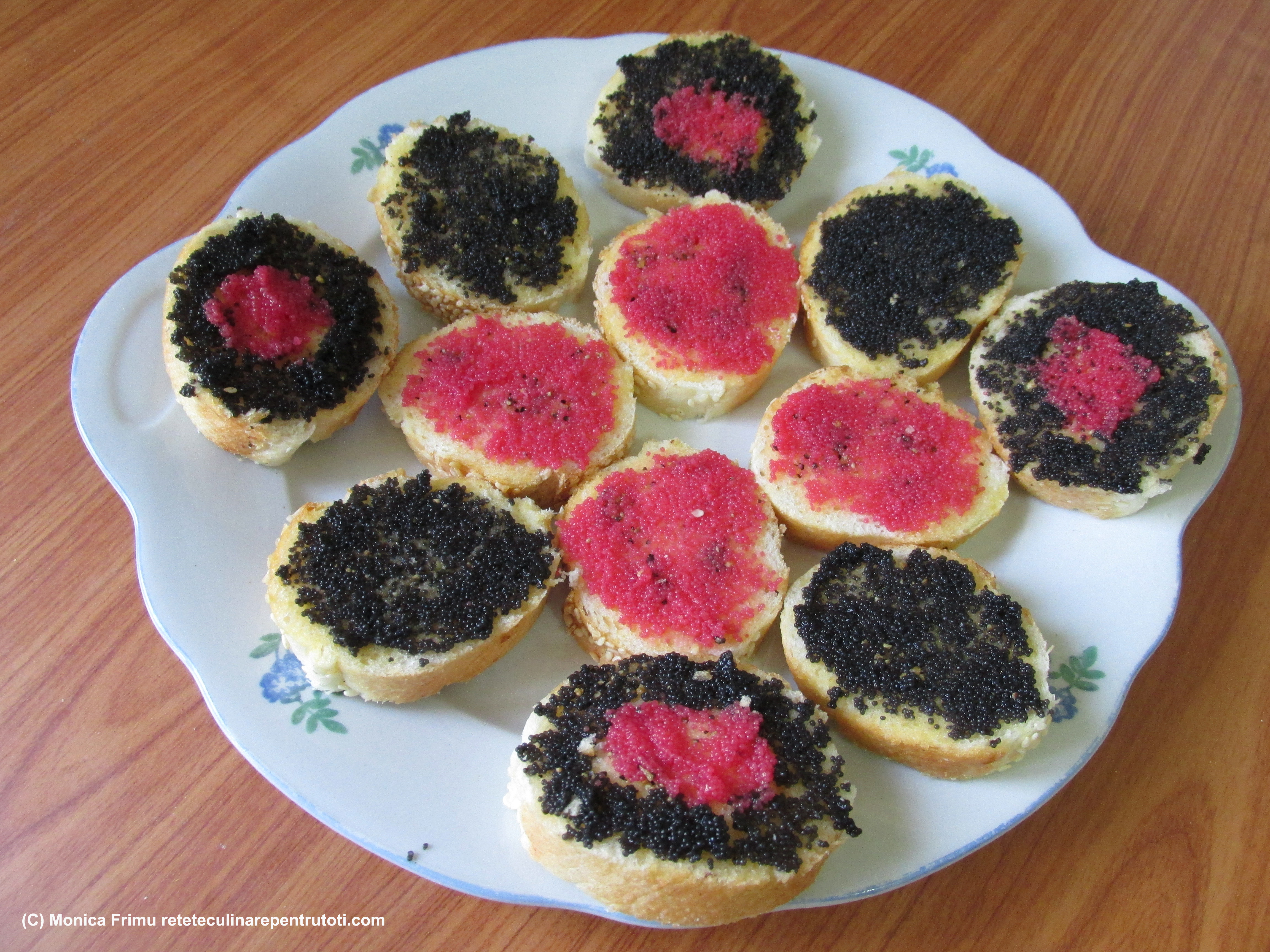 Ungem feliile crocante de secară cu margarină, așezăm câte 1 felie de brânză Gouda, presărăm partea albă de la ceapă verde tăiată mărunt. Punem în cuptorul preîncălzit la foc mai mare (200) aprox. 10 min., până se topește brânza. Scoatem, presărăm pe fiecare icre roșii și servim.