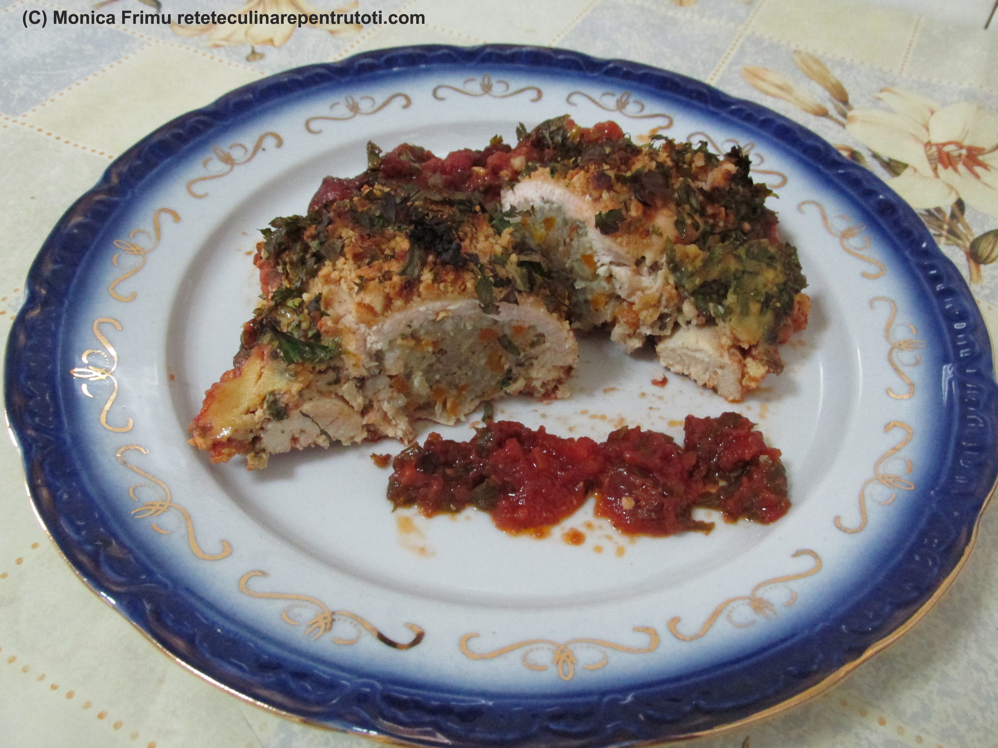 Tăiem pieptul ½ și la fiecare bucată îi tăiem câte un buzunar. Curățăm și tăiem mărunt ceapa, morcovul și țelina, tocăm pătrunjelul, fierbem pe jumătate orezul și scurgem, pisăm boabele de caju. În 3 linguri de ulei și 2-3 linguri de apă călim legumele până se înmoaie. Într-un bol batem oul, îl amestecăm cu legume, orez, ierburi uscate, jumătate din cantitatea de caju, sare și piper. Cu această compoziție umplem buzunarele și le prindem cu scobitori.