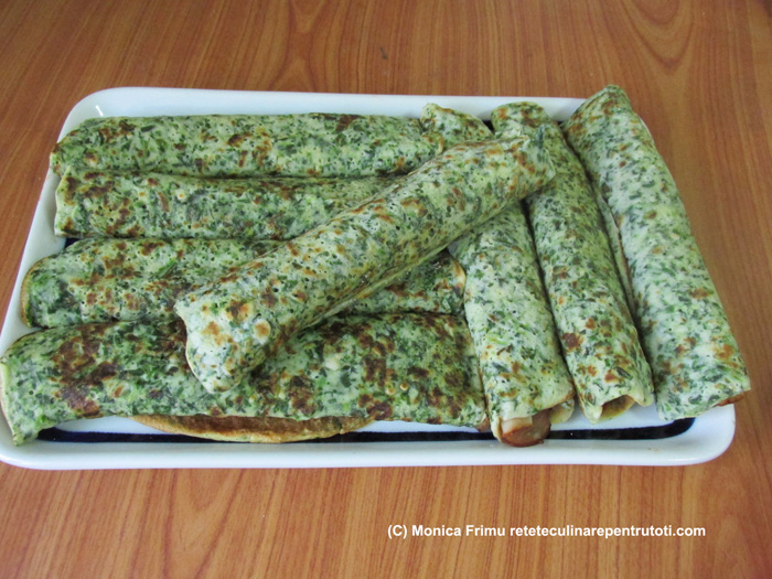 Decongelăm și scurgem bine spanacul. Amestecăm făina cu laptele, batem ouăle cu sare. Le încorporăm în lapte, adăugăm uleiul, mixăm, apoi apa și omogenizăm. Lăsăm să stea 15 min. la temperatura camerei. Încingem o tigaie teflon, la foc mediu, turnăm un polonic din compoziție, o întindem pe fundul tigăii prin mișcări de rotație și prăjim pe o parte 2 min., apoi pe cealaltă parte 1 min. Le scoatem și ținem acoperite până se termină compoziția, în total au ieșit 8 clătite. Pe fiecare clătită presărăm brânză, așezăm o felie de jambon și rulăm. Servim simple sau cu iaurt.