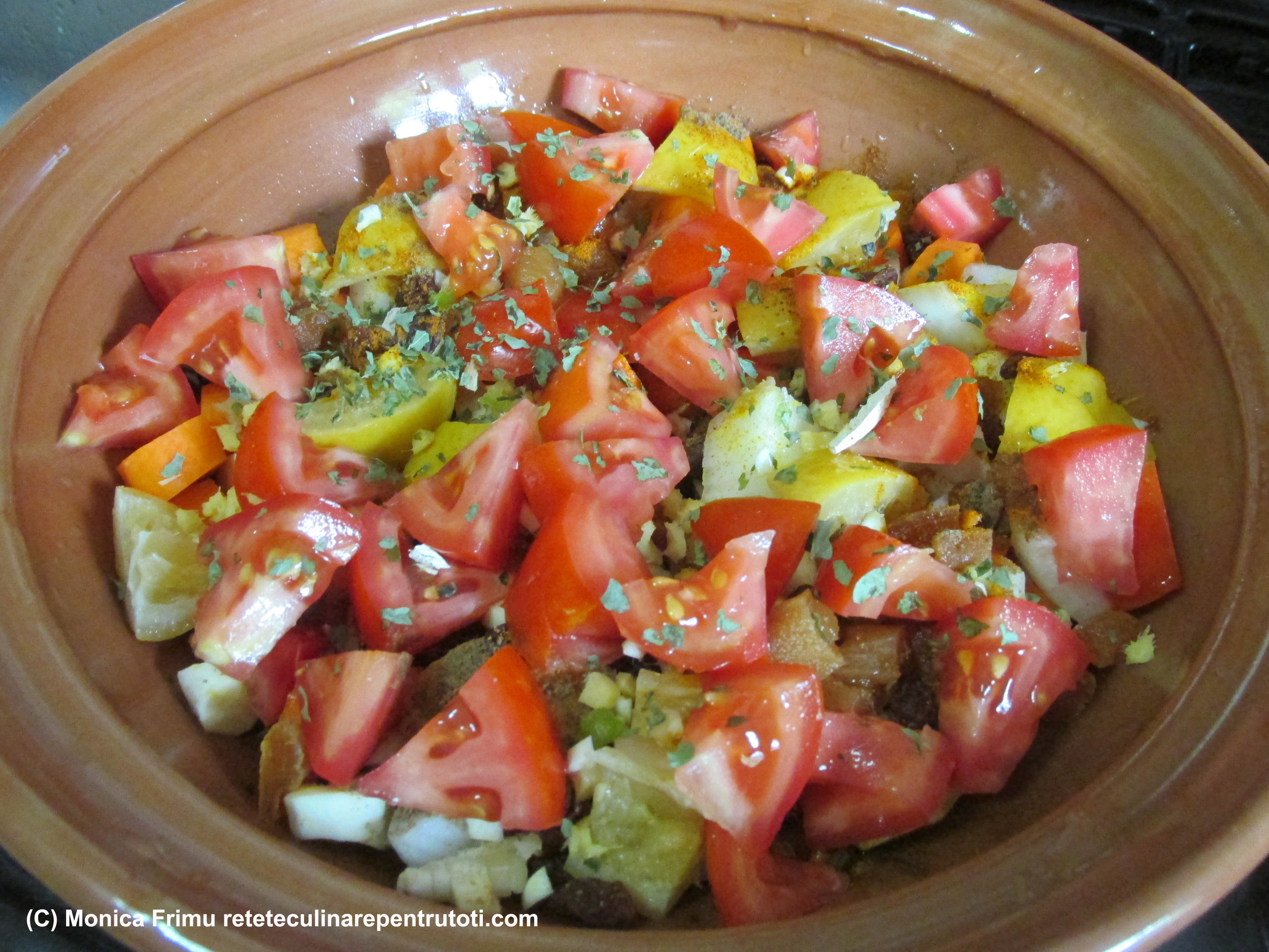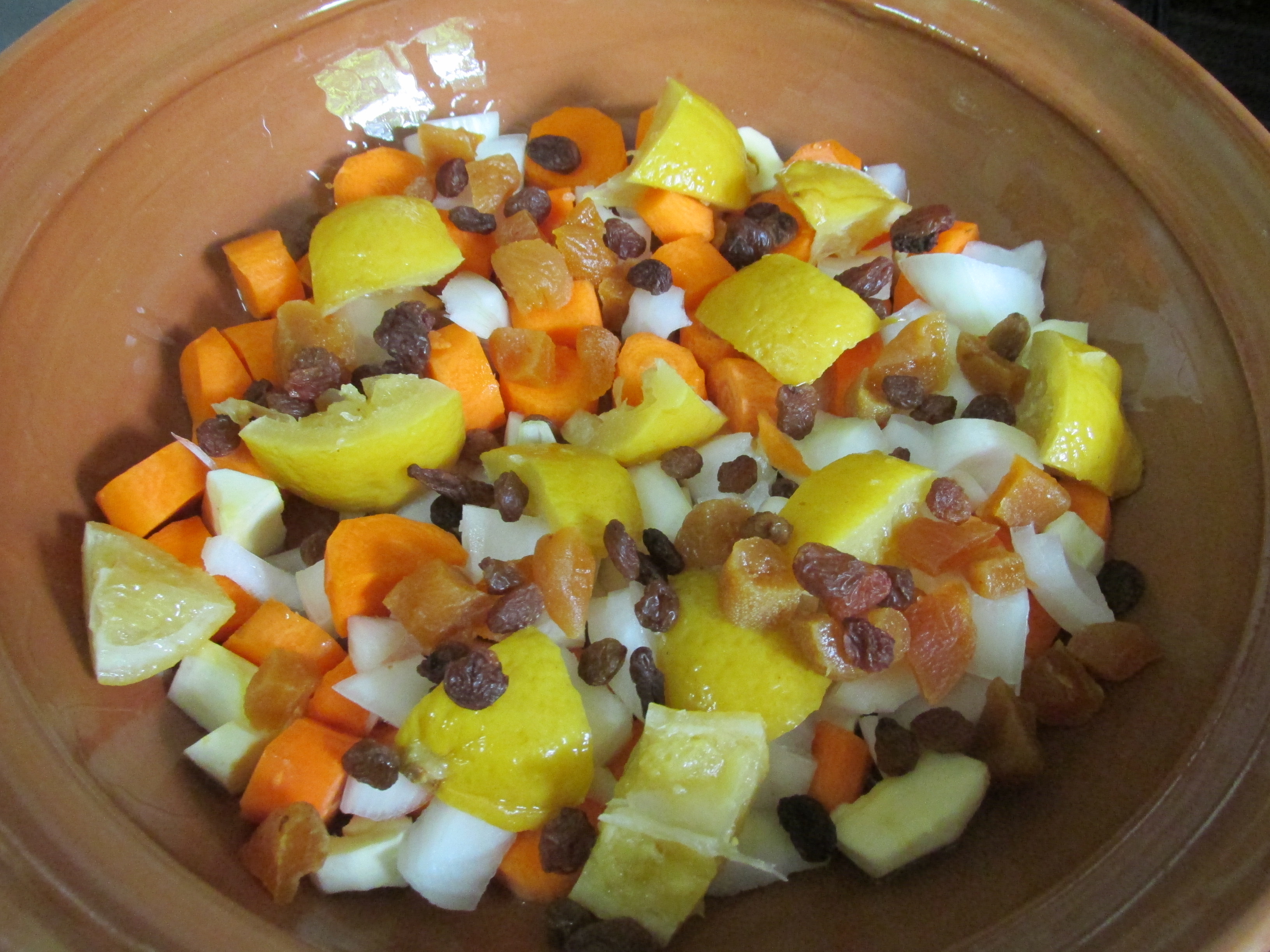 În vasul tajine uns cu 2 linguri de ulei așezăm păstârnacul, morcovii, ceapa, lămâia și fructele.