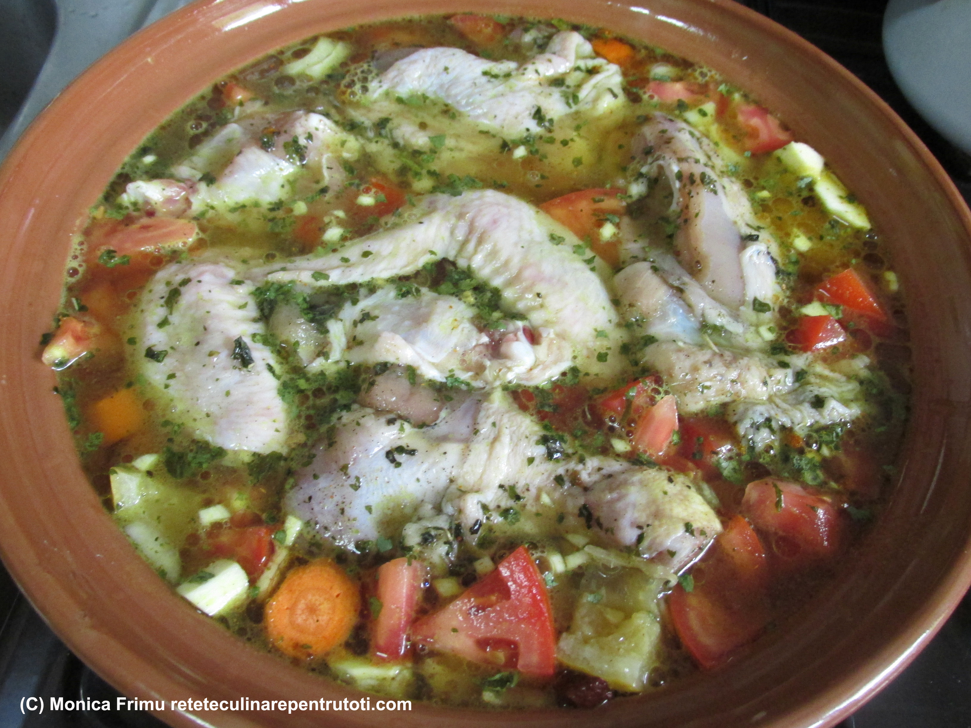 Așezăm bucățile de carne și turnăm supa de pui.