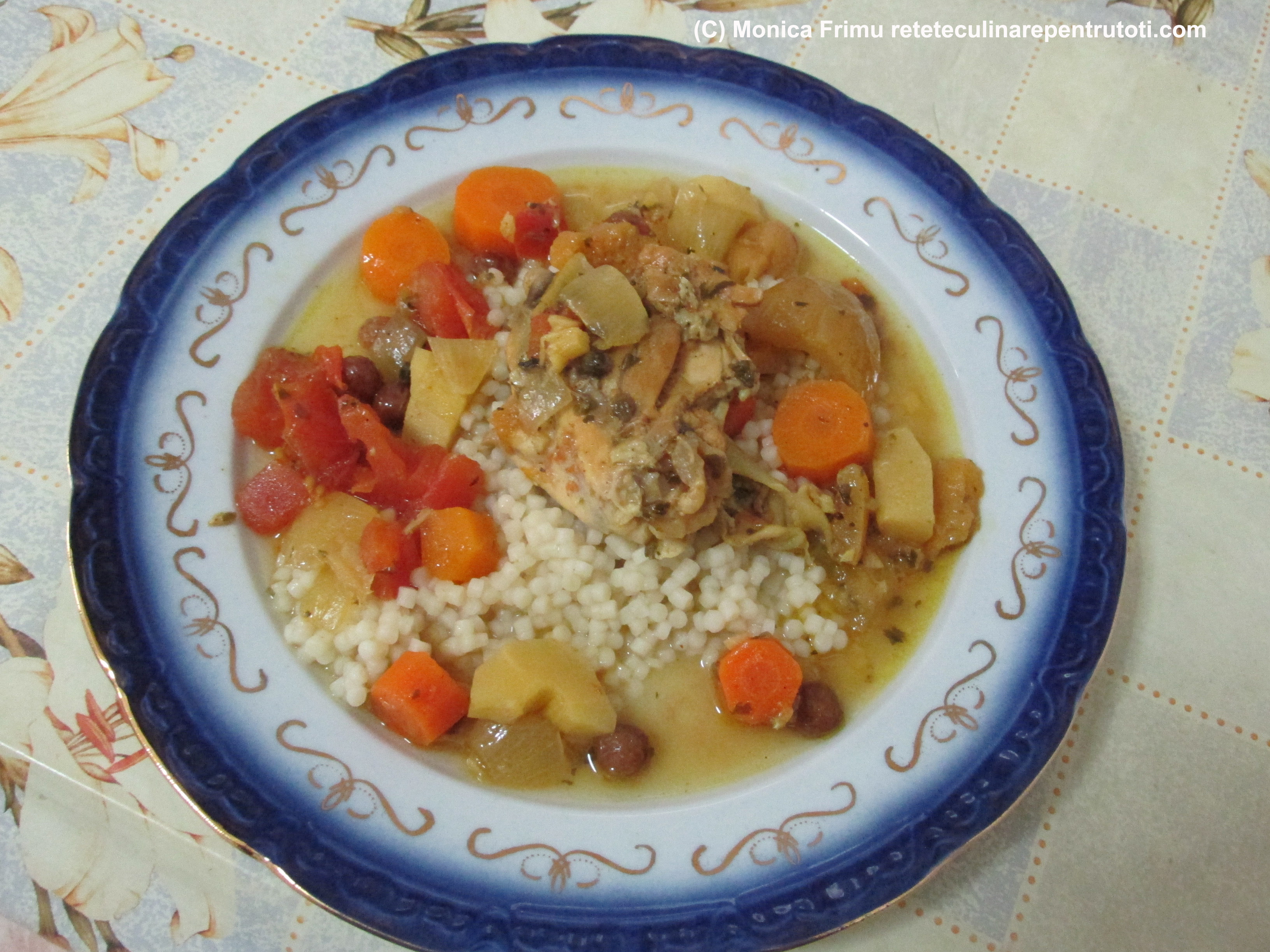 Servim pui cu legume, cus cus și sos.