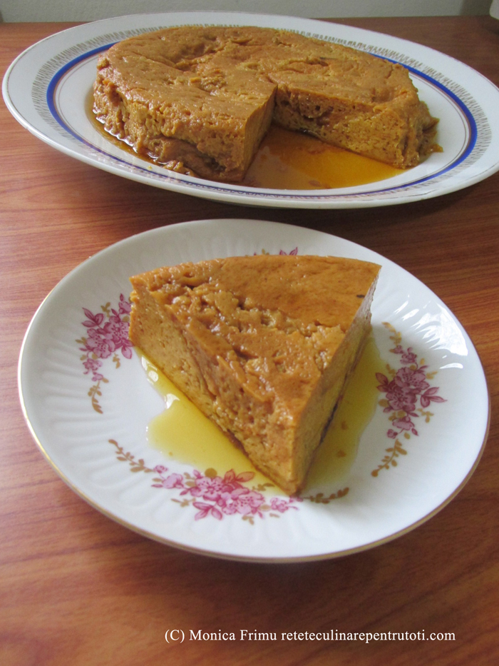 Punem 8 linguri de zahăr într-o oală (diametru 20 cm), pe foc mediu. Când începe să se topească reducem flacăra la mic și mișcăm din când în când oala pentru a se carameliza tot zahărul (va primi culoarea maro-roșcat). Stingem focul și prin mișcări de rotație acoperim pereții oalei cu caramel apoi răcim. Mixăm ouăle cu 6 linguri de zahăr și un praf de sare. Turnăm laptele treptat și mixăm la viteză mică până devine spumos. Turnăm compoziția în oală. Punem în cuptorul preîncălzit la foc mediu aproximativ 50 minute-1 oră, până compoziția se încheagă. Răcim și punem în frigider până a doua zi. Desfacem marginile cu lama unui cuțit și răsturnăm pe un platou. Punem în frigider 2-3 ore pentru ca lichidul format să pătrundă în compoziția de ouă. Porționăm și servim.