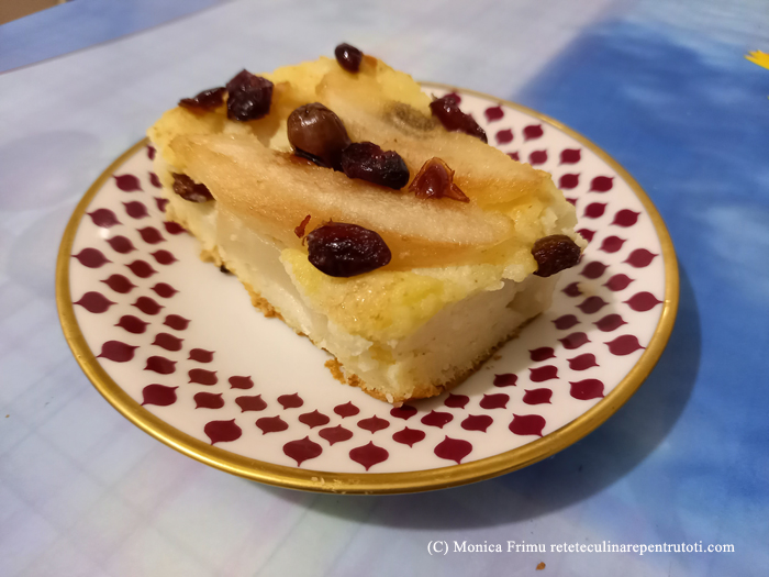 Batem bine cele 3 ouă, turnăm laptele și omogenizăm. Turnăm uniform peste pere și punem în cuptor până se încheagă, aproximativ 25 minute. Presărăm pe toată suprafața nucile păstrate, presăm puțin și punem în cuptor 5 minute. Răcim în tavă. Porționăm și servim.