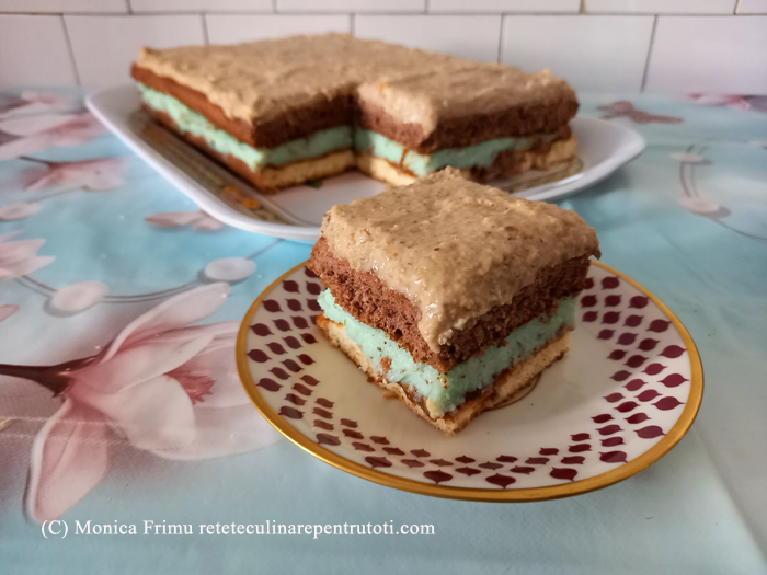 Pentru un blat mixăm 3 albușuri spumă tare cu un praf de sare. Adăugăm zahărul și mixăm până devin cremoase și lucioase. Punem gălbenușurile și mixăm câteva secunde până omogenizăm. Încorporăm 4 linguri de făină amestecând ușor cu o lingură. Întindem uniform într-o tavă tapetată cu hârtie de copt. Punem în cuptorul preîncălzit la foc mediu (180) 15 minute, până se desprind marginile blatului de hârtie. La fel procedăm cu a doua foaie de blat punând doar 3 linguri de făină, în plus 1 lingură de cacao. Răcim, îndepărtăm hârtia și așezăm primul blat pe un platou. Întindem uniform crema de gris. Acoperim cu al doilea blat, presăm ușor și acoperim cu crema de nuci. Punem în frigider până a doua zi. Porționăm și servim.