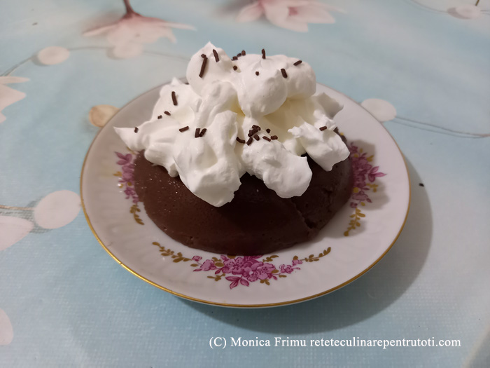 Rupem ciocolata bucățele. Clocotim laptele, punem ciocolata și amestecăm până se dizolvă. Turnăm treptat grisul și amestecăm continuu, pe foc mediu, până se îngroașă, aproximativ 5-7 minute. Punem zahărul, esența și amestecăm 2-3 minute, până se dizolvă. Răcorim, punem untul și mixăm la viteză maximă 3 minute. Umezim castronele cu apă rece, turnăm uniform compoziția, punem în frigider minim 3 ore. Răsturnăm pe farfurii, deasupra punem frișcă, presărăm decor de ciocolată și servim.