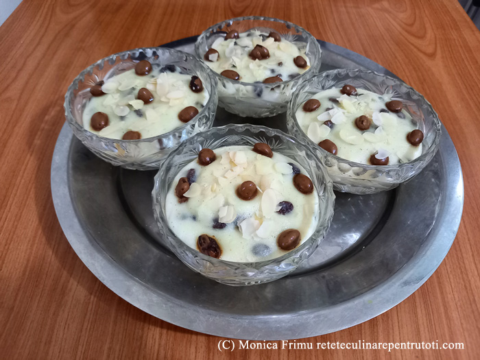 – 1 l lapte, 125 g gris, 100 g zahăr, 100 g stafide, 30 g unt, 1 linguriță esență de migdale verzi, stafide trase în ciocolată, fulgi de migdale