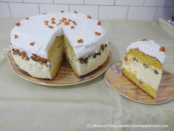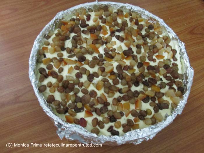 – în plus- 100 g stafide, 2 linguri cuburi de coji de portocale din dulceață, 200 ml frișcă, rom