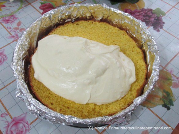 Întindem un strat subțire de cremă pe foaia de blat care va acoperi tortul. Tapetăm forma de tort cu folie de aluminiu, așezăm cealaltă foaie de blat și întindem uniform crema.