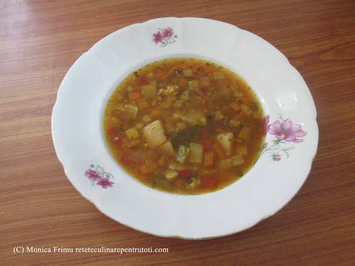 Curățăm ceapa, usturoiul și tăiem mărunt. Tăiem carnea cuburi, punem într-o oală, turnăm apa, acoperim parțial și fierbem 30 minute. Punem legumele congelate, morcovii, fasolea verde, ceapa, sare, piper după gust și fierbem 10 minute. Încălzim uleiul pe foc mare, prăjim usturoiul 1 minut și punem în oală. Adăugăm oțetul, leușteanul, pătrunjelul verde și fierbem 2-3 minute. Servim ciorba caldă, simplă sau cu smântână.