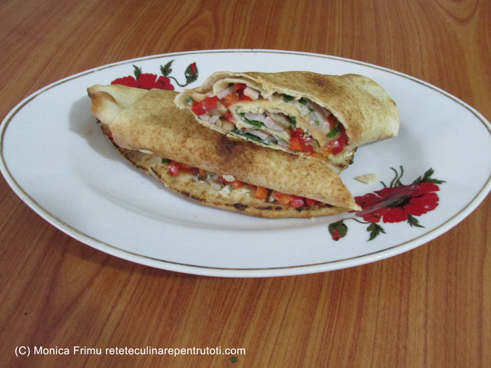 Tapetăm o tavă cu hârtie de copt, pe care o ungem cu ulei. Curățăm și tăiem varza fâșii subțiri. Amestecăm iaurtul cu pasta de ardei. Tăiem roșiile rondele. Ungem o lipie pe o parte cu amestecul de iaurt, presărăm ¼ varză, acoperim cu felii de șuncă și punem din loc în loc rondele de roșii. Rulăm și așezăm în tavă cu partea întreagă în sus. La fel procedăm cu celelalte lipii. Le ungem cu amestec de iaurt. Punem în cuptorul preîncălzit la foc mai mare (200) 15 minute. Servim imediat.