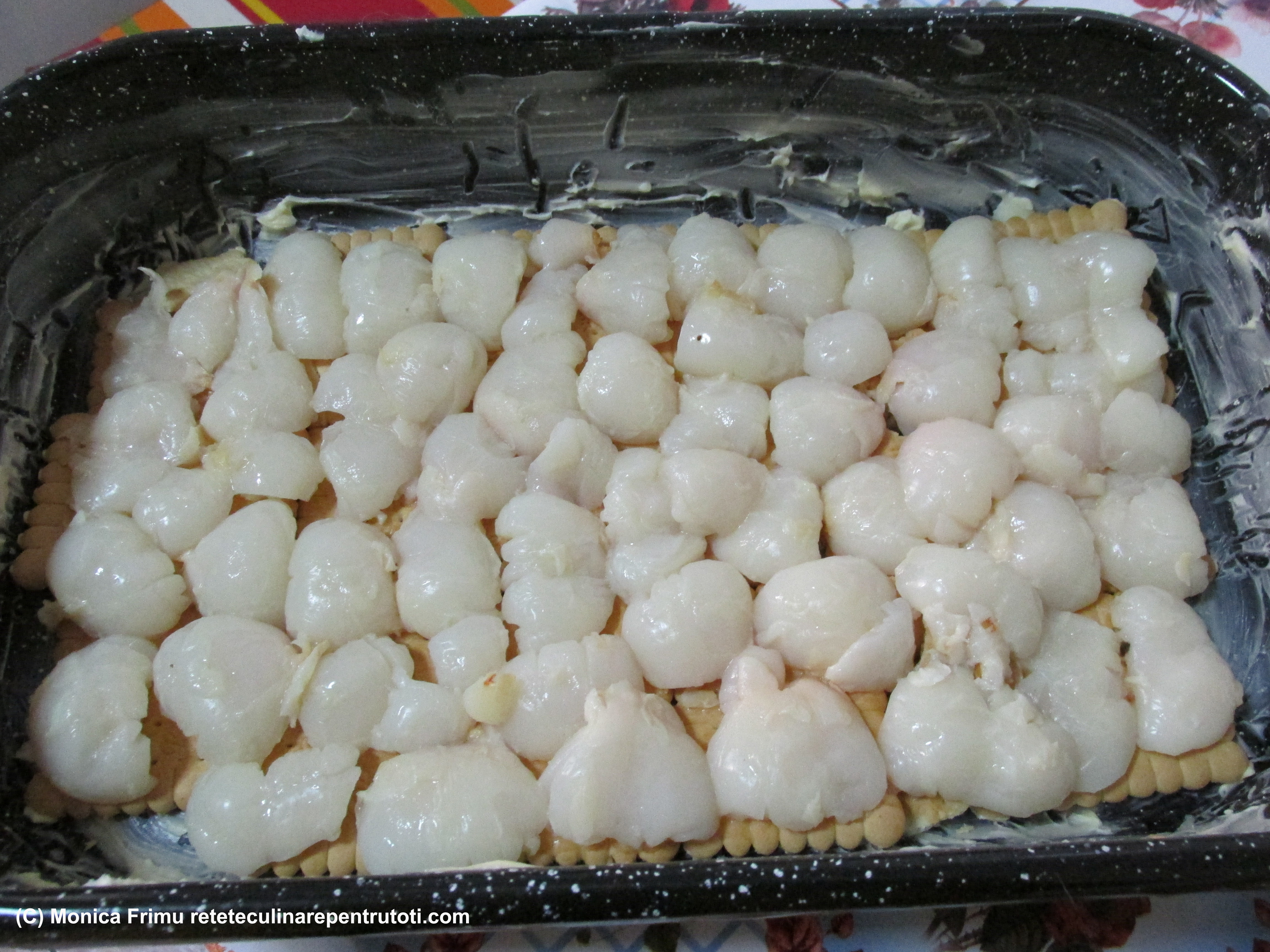 Amestecăm 250 g zahăr praf cu nuca, gălbenuşurile sfărâmate bine, litchi pasate. Pe o folie alimentară întindem compoziţia, peste întindem uniform o cremă obţinută prin frecarea untului cu 150 g de zahăr praf şi esenţa de portocale. Presărăm fructele înmuiate în prealabil în zeamă de compot şi rom şi scurse.