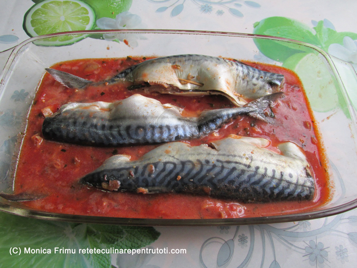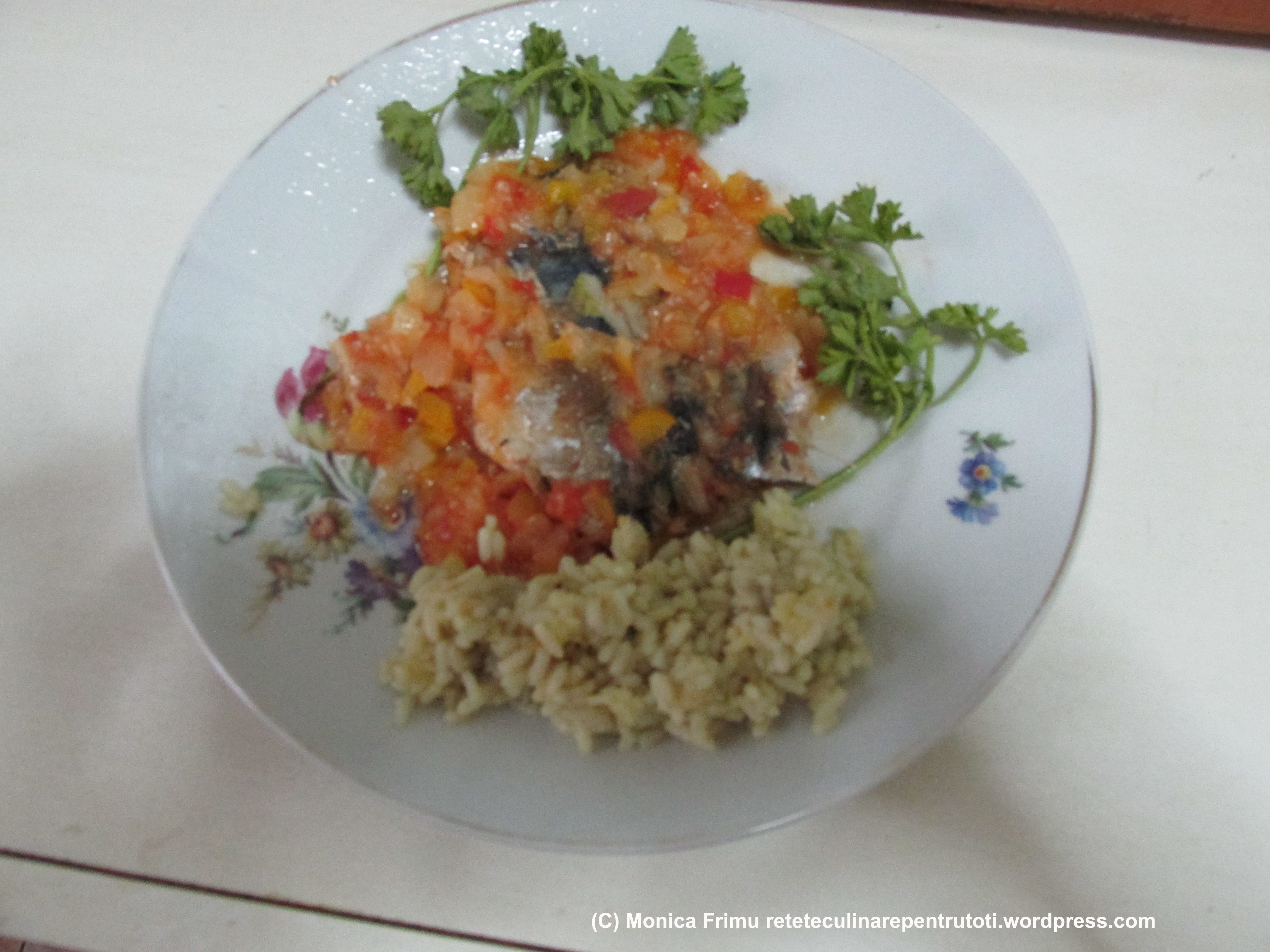 – 2 bucăți macrou, 70 ml supă de pui, 2 lingurițe sos de soia, 1 linguriță vin alb sec, 1 linguriță oțet de orez, 2 lingurițe zahăr, 1 linguriță boia de ardei iute, ½ linguriță piper alb măcinat, 3 linguri ulei de arahide; pentru servit- orez fiert simplu, 2 cepe verzi tăiate mărunt, rondele subțiri de castraveți