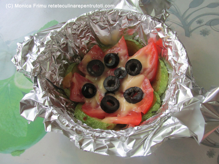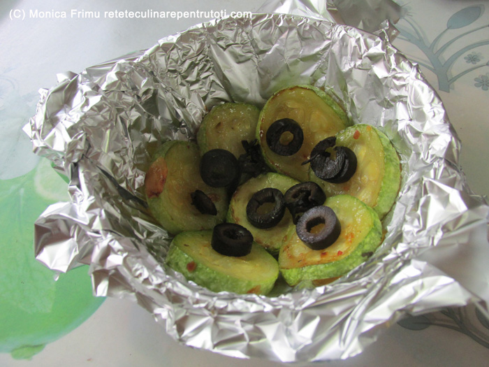 Spălăm bine dovlecelul, tăiem rondele de 0,5 cm grosime. Prăjim fulgii de usturoi în ulei 30 sec. Punem ½ felii de dovlecel, presărăm Vegeta, turnăm apa și fierbem sub capac, la foc mediu, aprox. 10 min., întorcându-i o dată. Oprim focul și răcorim. Curățăm și zdrobim cățelul de usturoi, amestecăm cu maioneza și puțină sare. Tăiem roșia felii. Tapetăm un bol cu folie de aluminiu lăsând marginile în afară, așezăm pe fund și margini felii de dovlecei călduțe, presărăm 1 lingură de măsline.