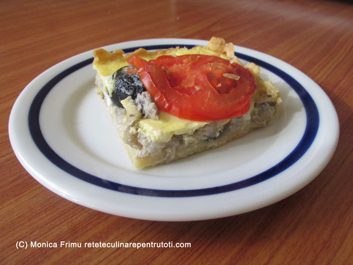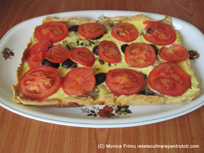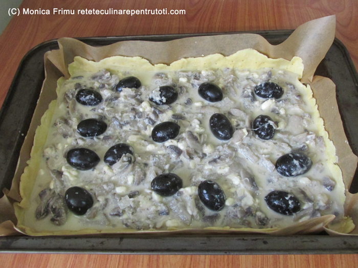Amestecăm făina cu sarea, oul, untul tăiat bucățele, turnăm treptat apa și frământăm un aluat sfărâmicios. Îi dăm forma unei mingi, împachetăm în folie alimentară și punem în frigider 30 min. Curățăm și tăiem ceapa mărunt, ciupercile feliuțe subțiri, roșiile rondele. Tăiem mozzarella și telemeaua cubulețe. Călim în ulei ceapa, 2 min., adăugăm ciupercile și fierbem până se reduce zeama. Punem măslinele, mozzarella, brânza telemea, 2 linguri de smântână, 1 ou, amestecăm și stingem focul. Întindem aluatul pe o hârtie de copt de dimensiunile tăvii astfel ca să acopere și o parte din margini. Punem în tavă și înțepăm din loc în loc cu o furculiță. Turnăm umplutura și nivelăm.
