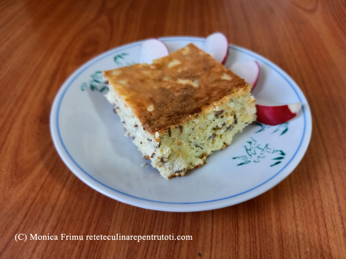 – 3 ouă, 300 g brânză telemea ușor desărată, 200 g urdă, 200 g iaurt, 1 lingură făină, 2 linguri semințe de chimen, 2 linguri muștar, piper; unt și făină pentru formă