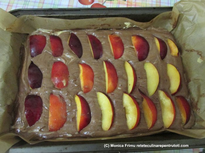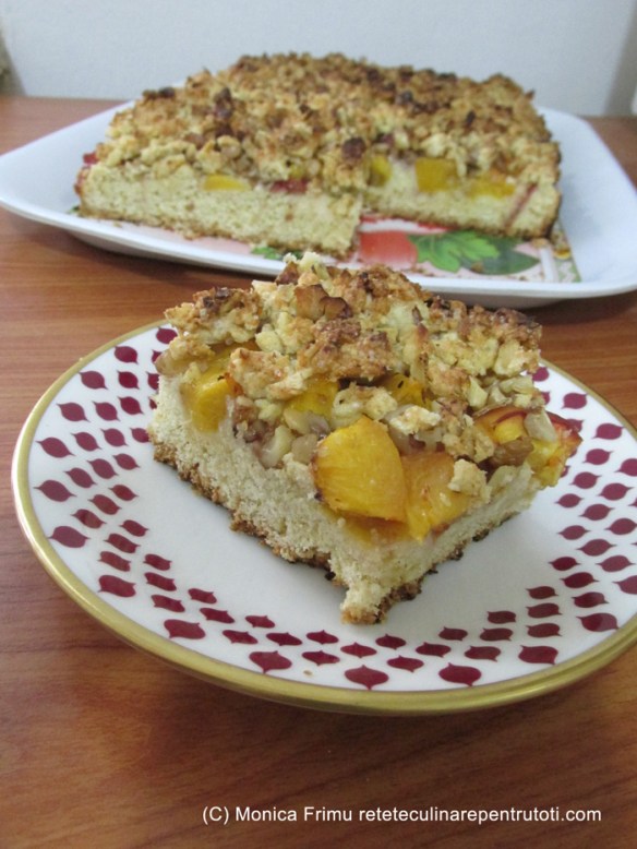 – 6-8 nectarine, 1 ou+1 gălbenuș, 250 g unt, 150 g+1 lingură zahăr, 1 plic zahăr vanilat, 400 g făină, 1 plic praf de copt, 60 g fulgi de ovăz, 1 linguriță praf de ghimbir, 1 lingură zeamă de lămâie, 100 g nuci, sare
